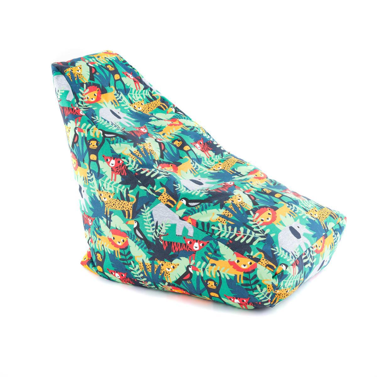 Crafted from cotton, this kid's relaxer bean bag features a jungle-inspired animal design on a green background.