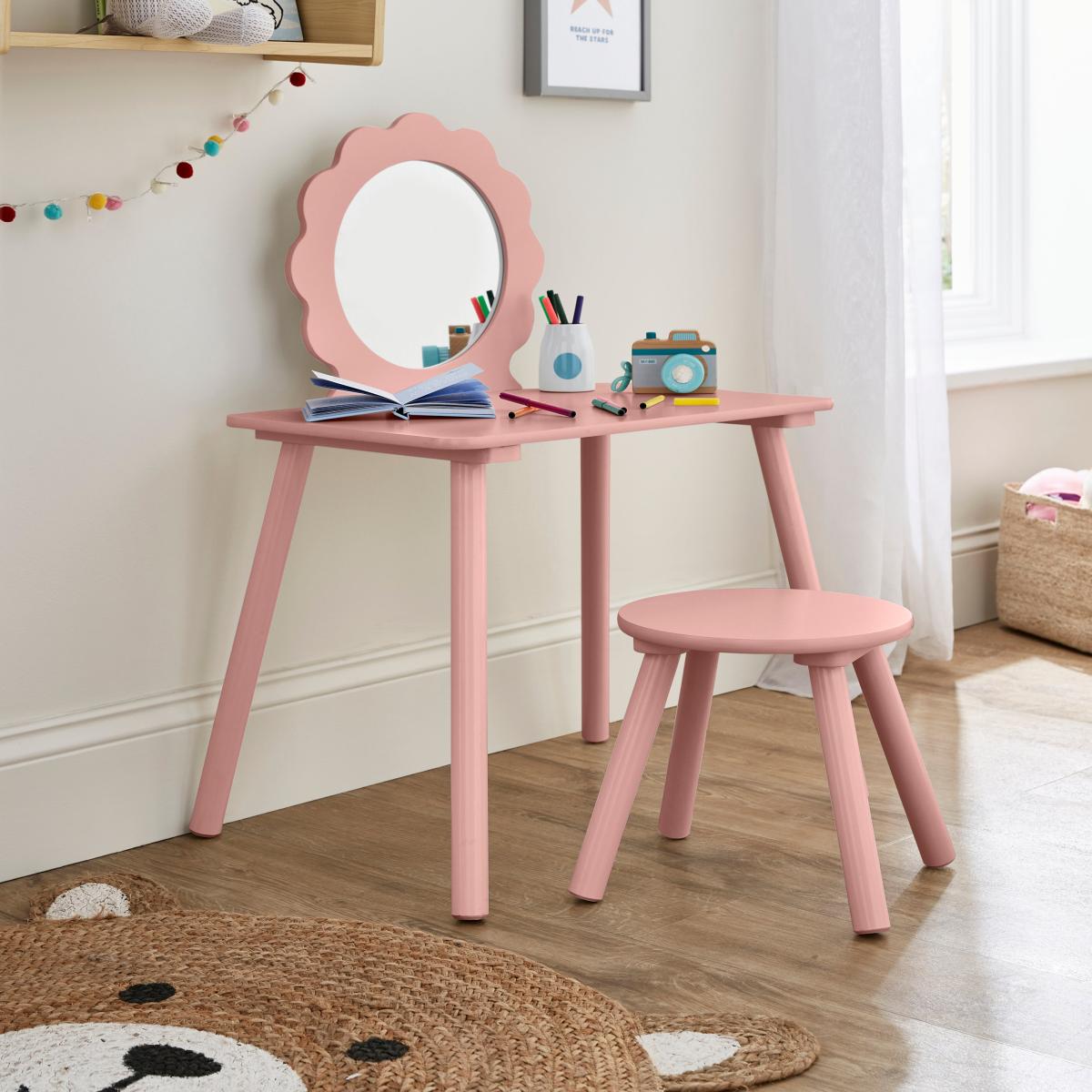 I love the kids’ dressing table because of its soft pastel pink tone, which adds a gentle, playful touch to any child's room. It works particularly well in light, Scandinavian-inspired interiors or schemes with subtle colour palettes, where it can serve as a charming focal point. For practical styling, consider adding a small colourful organiser or tray on top for accessories, and pairing it with plush cushions or a cosy rug underneath to create a welcoming space for play and self-care. Its compact size makes it versatile, ideal for bedrooms or playrooms, and it can be easily integrated into a variety of décor styles thanks to its simple, timeless design.