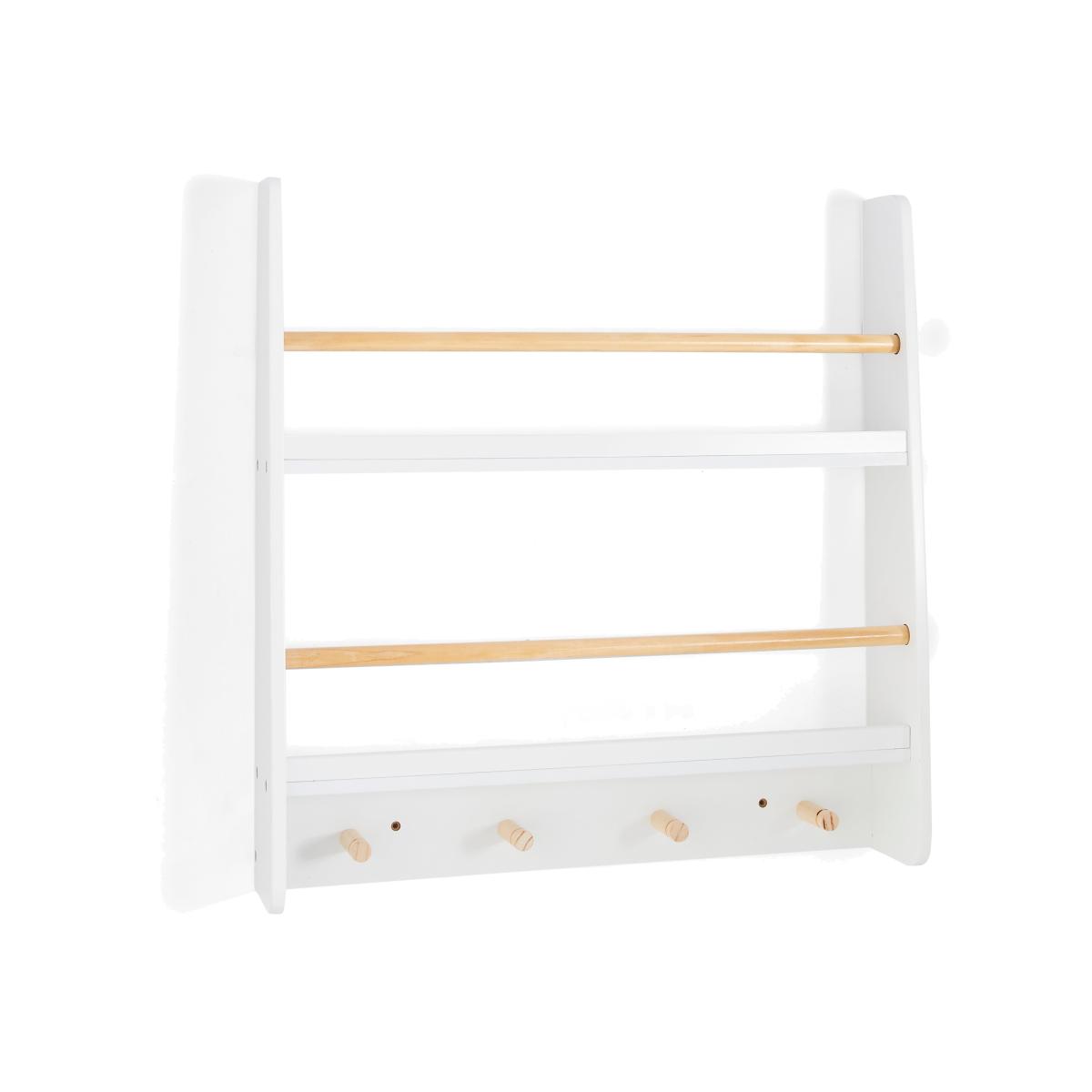 I love this small wall bookcase for kids because its simple, clean design makes it adaptable to a variety of nursery or child's room interiors. Its white finish and natural wooden accents give it a fresh, Scandinavian feel that can complement both colourful and neutral schemes. It works particularly well in small spaces, making it practical for storing books, toys, or decorative pieces at a child-friendly height. For styling, consider arranging a few favourite picture books or small toys on its shelves, and pair it with soft textiles or playful accessories nearby to create a cosy, organised space that grows with your child.