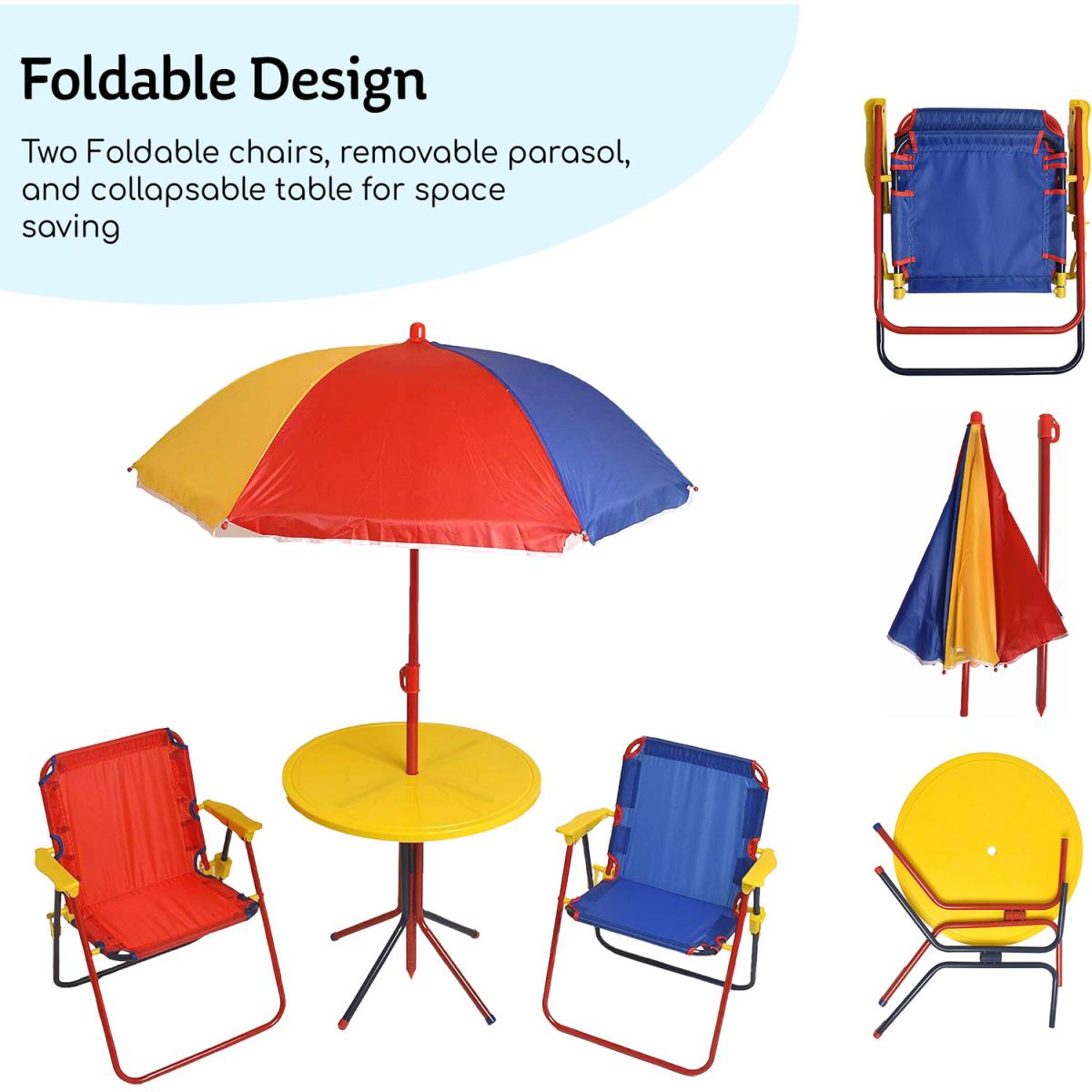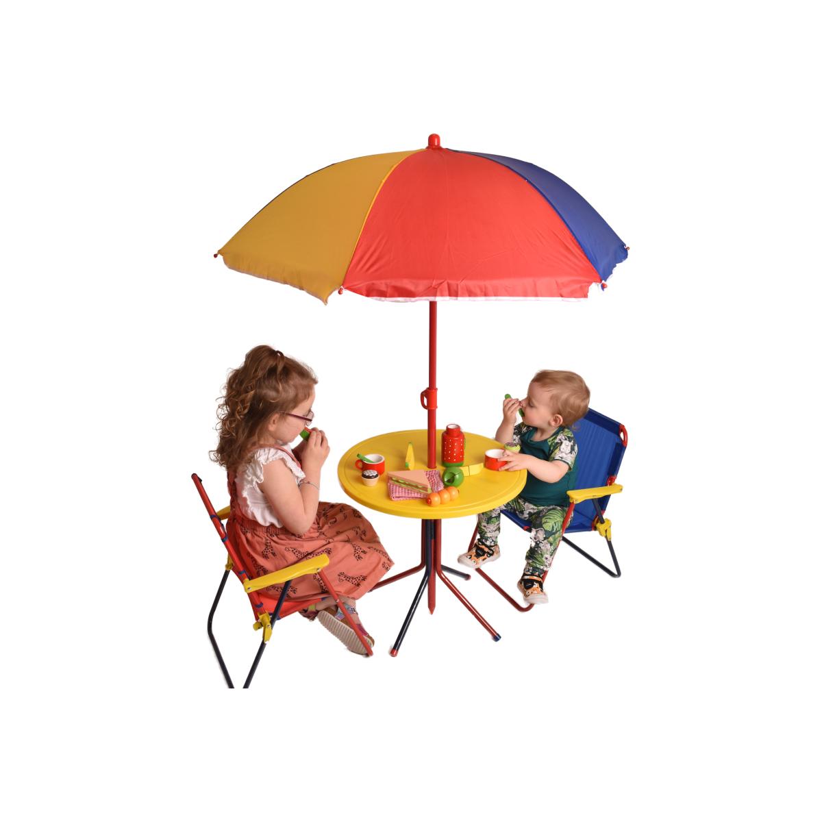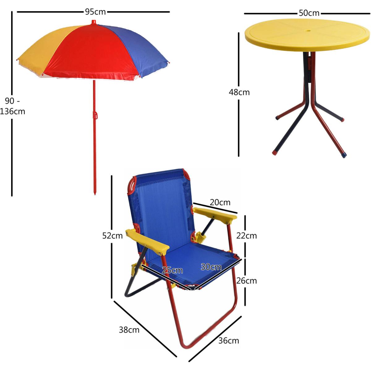 Introducing our delightful kid's outdoor garden Patio set! This colourful and captivating set is designed to provide endless hours of fun and comfort for your little ones. With two foldable seats and a round table that easily slots together, it's perfect for playdates, tea parties, and creative adventures. The sturdy metal framework ensures durability, while the plastic table top guarantees effortless cleaning. Complete with a vibrant multicoloured design, a parasol for shade, and a lightweight construction, our Patio set promotes outdoor play, social interaction, and sparks the imagination of young minds. Get ready for unforgettable moments of joy and exploration in the great outdoors!