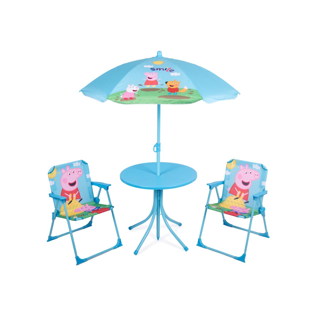 Peppa Pig 4-Piece Kids' Patio Set Make outdoor fun even more exciting with this adorable Peppa Pig-themed 4-piece patio set! Featuring a cheerful blue colour and delightful images of Peppa and her friends, this set is perfect for young fans aged 3 and up. It includes a sturdy, collapsible table, two foldable chairs, and a coordinating parasol to provide shade during sunny play days. Designed with little ones in mind, it's easy to set up, simple to store, and just right for picnics, crafts, or giggles with Peppa and pals!