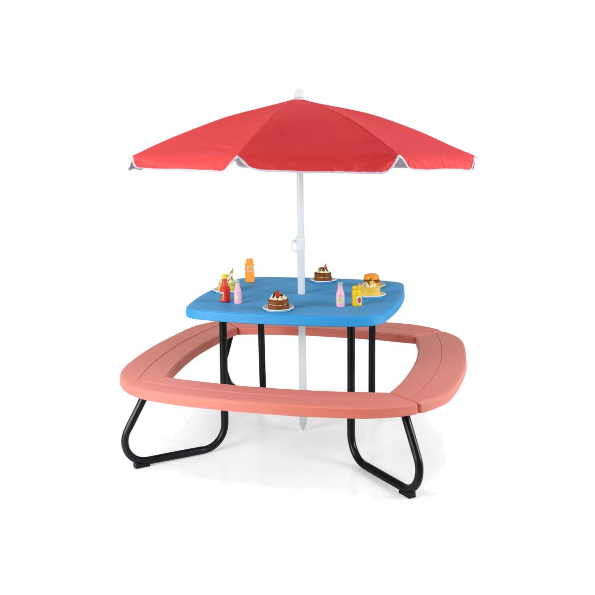 The kids picnic table is designed with fun and safety in mind. It is equipped with a height-adjustable umbrella, ensuring your little ones are always shaded from the sun and protected from light rain. The robust 8-bone structure combined with high-quality polyester fabric promises durability and relentless protection. Additionally, you can remove the umbrella and use the kids play table indoors. Constructed from weather-resistant HDPE and heavy-duty metal, this children outdoor table is built to withstand the elements and the energetic play of kids.