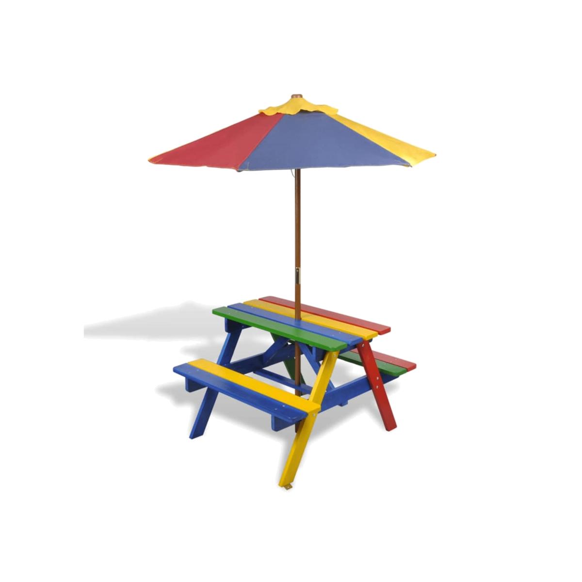 This fantastic 2-in-1 kids wooden picnic table & bench is a great way to allow your little ones to play games or have a cool drink with their friends on the sturdy and colourful table, while the parasol protects them from the strong sun in summer days. This picnic set is extremely popular among children because of its adorable rainbow colour, the attractive parasol, and the comfortable benches on both sides. Kids Picnic Table with Benches and Parasol - Multi