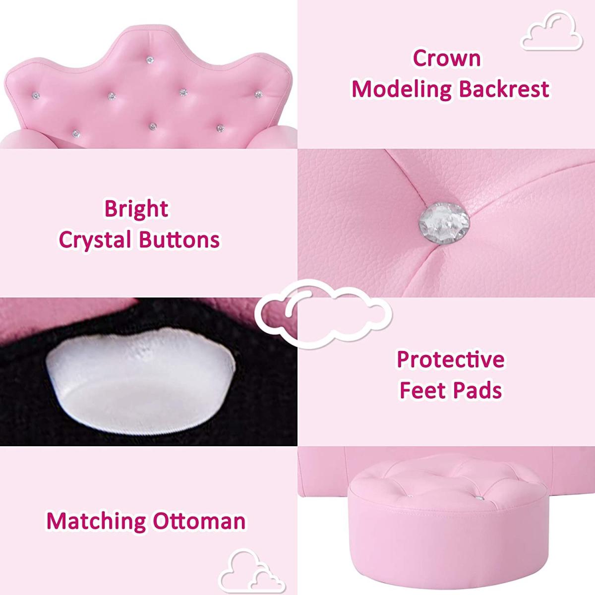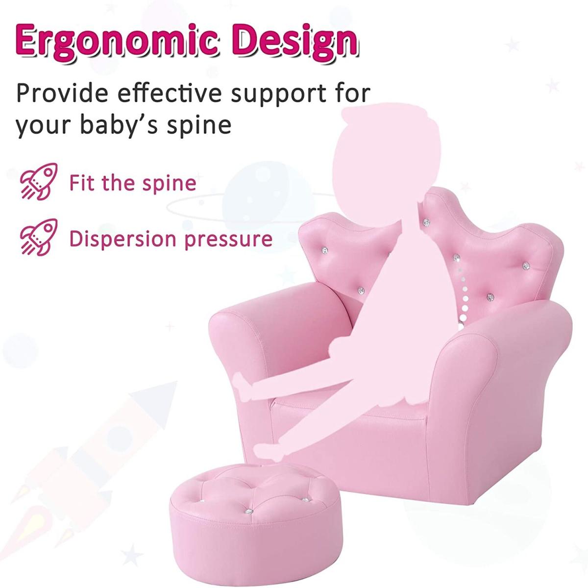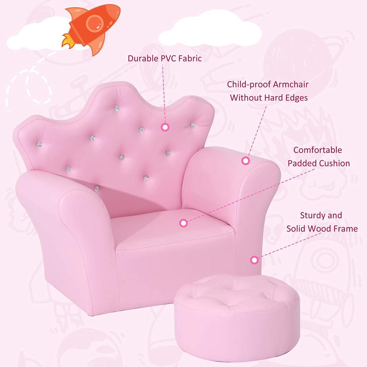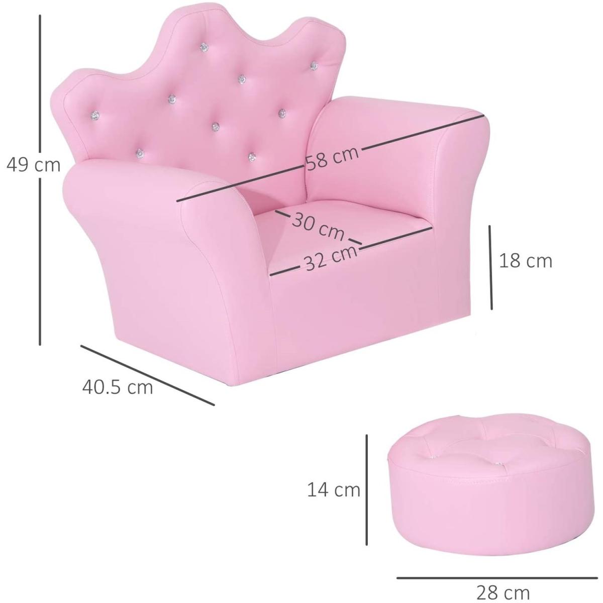 This stylish armchair is an ideal gift for your little Princess and will be a perfect decoration in the nursery or playroom. It features a soft cushioned seat, two-side armrest, and a footstool, providing your children with ultimate comfort and security. Perfect for crafts, drawing, and puzzles or simply relaxing after a hard day's play! Solid wooden frame with upholstered in PU leather.