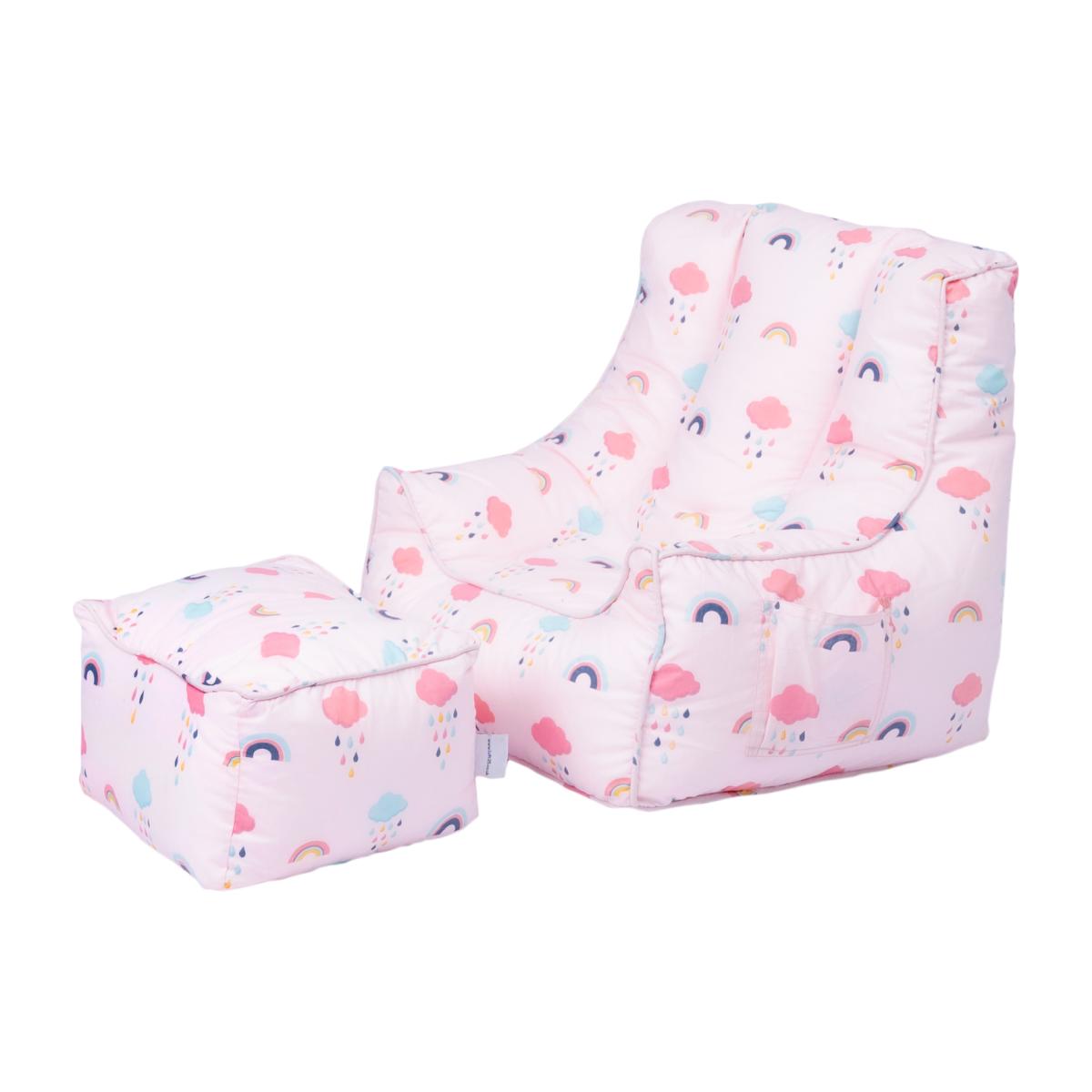 Our poufs are made from a polycotton fabric, typically used for comfortable seating. The side pockets on the bean bag are convenient little spaces where you can put things like remote controls, snacks, or small items you want to keep close while you're sitting and relaxing. They're like handy storage spots right on the bean bag. The approximate measurements are: 54 cm (height) x 45 cm (length) x 50 cm (width). Footrest: 20 cm (height) x 38 cm (length) x 28 cm (width).A Circular Beanbag Designed with a Built-in Carry Handle for Convenient Portability.