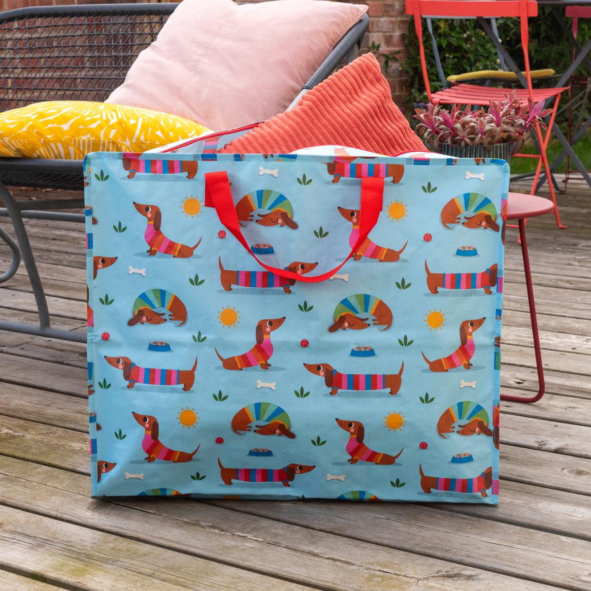 * Sausage dog design * Wipe clean with a soft cloth * Kids storage * Includes handles * Versatile use Perfect for storing toys and games this Sausage Dog Jumbo Storage bag is the perfect companion for a busy child. Doubling up as a lunch bag this bag, made from recycled plastic is versatile and stylish.