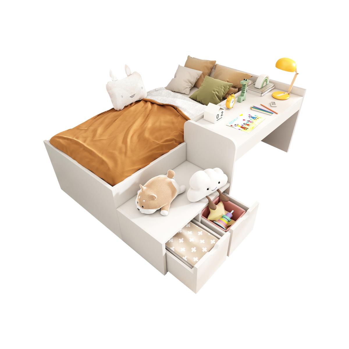 Combining practicality and creativity:Adopting the classic white color, whether it is a modern minimalist style or a warm pastoral style, it can perfectly blend with it, showcasing unique taste. The space is used to the extreme, and the bed frame is recessed to prevent the mattress from running. It is not only a comfortable sleeping bed for children, but also a quiet reading corner, convenient desk, and storage to meet the diverse needs of children. Two storage drawers can store your child's toys and daily necessities, and the cut-out handle design makes the drawers easy to pull out. There is also storage space under the bed to accommodate large items and keep the room tidy. The sides of the bed have been raised for safety, which allows your child to sleep comfortably. The curved edge design of the board and transparent corner guards can avoid your child bumping, and we also have a bottom felt foot pad to prevent sliding for extra safety. Notice:The bed frame does not include the mattress, does not require a box spring and comes with beauty mark stickers as well as simple tools and instructions for quick assembly, to minimise the risk of damage the bed frame is sent in three parcels and may arrive on different dates. If parts are missing from all three parcels, please contact customer service. Description
