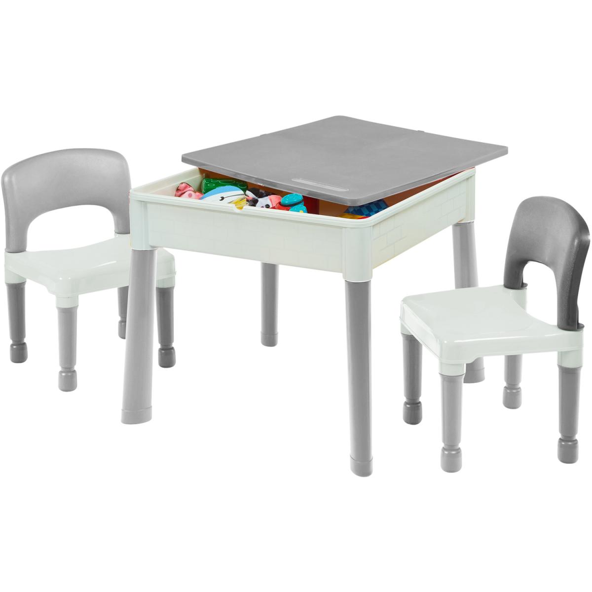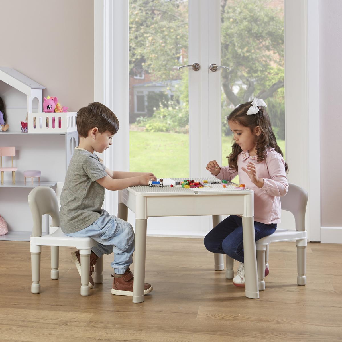 This Kids Square 5 in 1 Activity Table and 2 Chairs are ideal for ages 2 years and older. This set comes with a reversible tabletop smooth side that is good for writing, eating and playing on. The other side includes a construction tabletop that is compatible with all leading brick brands. The deep base can hold small toys, pens or pencils. Alternatively, it can be used for sand or water play, the table includes a plug in the middle of the table to make cleaning up quick and easy. The set is simple to put together no tools are needed simply click the pieces together. The table, tabletop, plug and chairs are made from non-toxic plastic. The set has been safety tested for durability and stability. This set has trumpet style legs to give additional stability. The whole set is lightweight so can be safely lifted and can be moved indoors or outdoors.