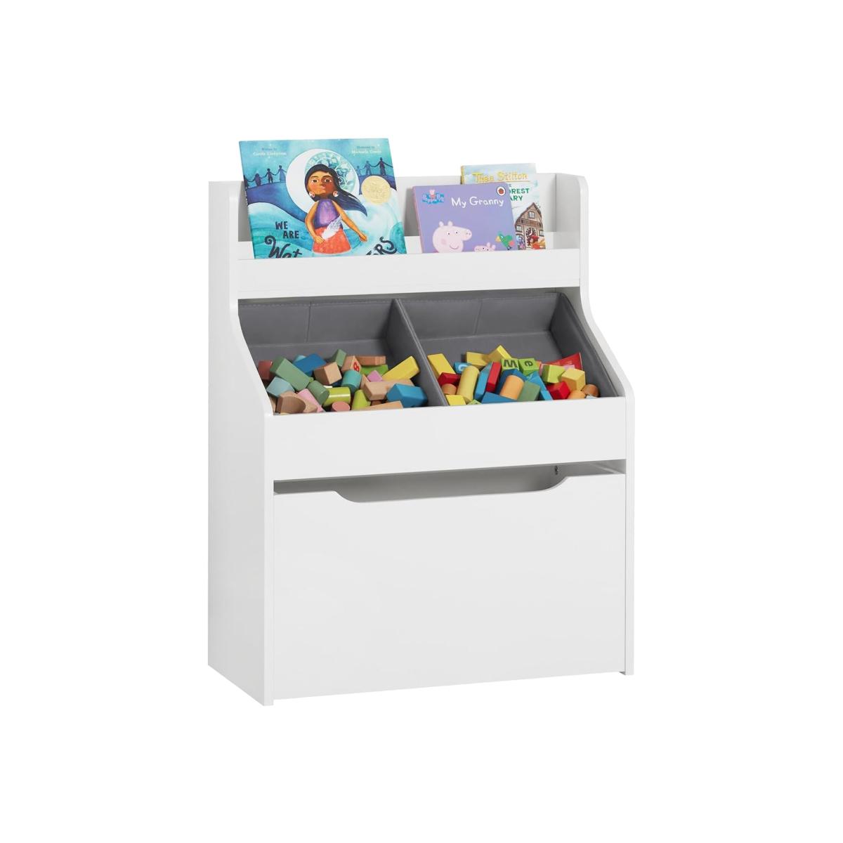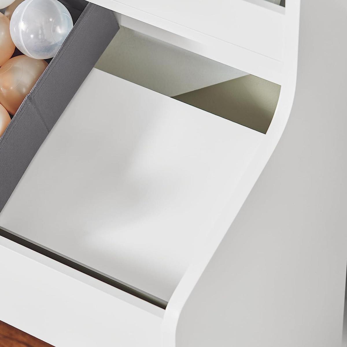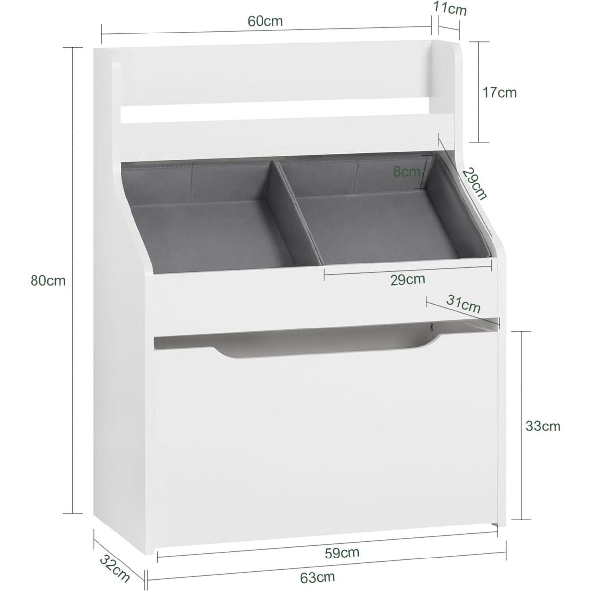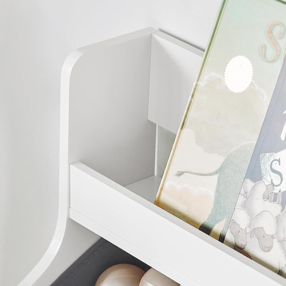 Modern design children storage shelf will blend perfectly with any decor. An ideal addition to any playroom and childrens room. The shelf on the top is ideal for storing books.2 fabric boxes in grey are ideal for storing toys like blocks, Lego. The large-capacity storage chest provides ample storage space for the toys, books and the other items. There are 4 wheels under the storage chest, easy to move. It can be pulled out completely as a great storage solution. Suitable for children ages 3 and up, it can help your kids develop a good habit of organizing. Sturdy wood with environmental protection paint and various storage options, an ideal choice for daycare, classroom and children's room.