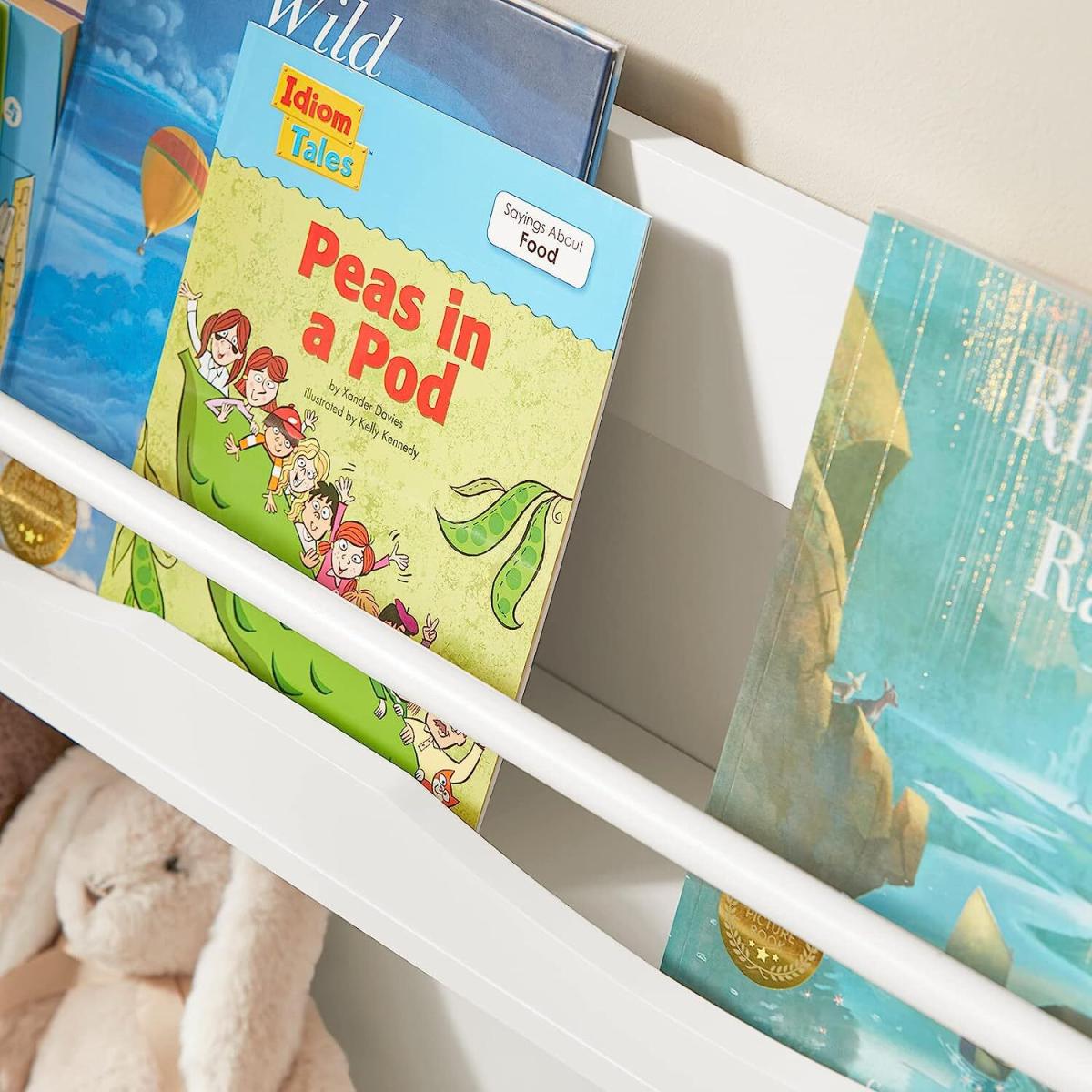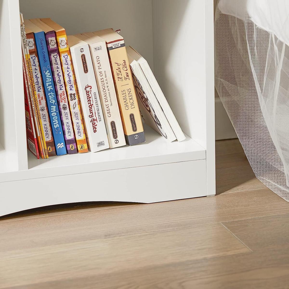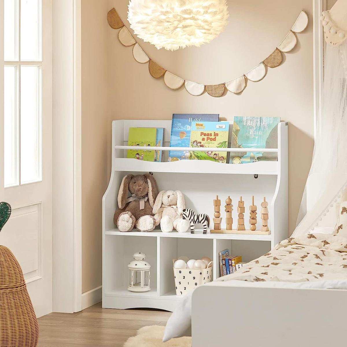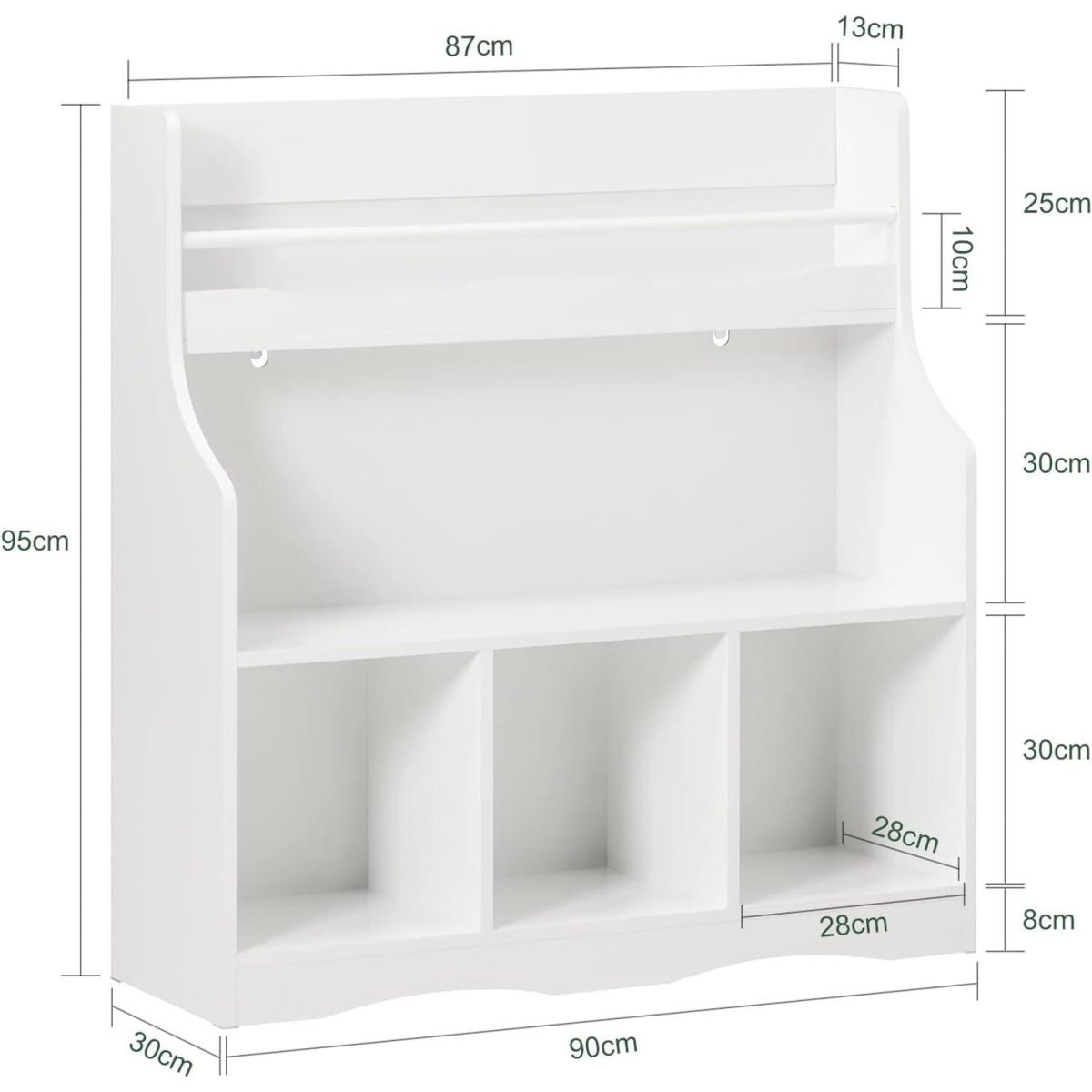 Modern design children storage shelf will blend perfectly with any decor. It will keep the room nicely organized. One shelf on the top is ideal for storing books, flexible for books of varying size and thickness. The round cross bar will prevent the books from falling off.1 large open storage compartment in the middle and 3 open storage compartments at the bottom provide plenty of storage and display space for the toys. Suitable for children ages 3 and up, promotes organization and reading skills. Sturdy wood with environmental protection finish and the anti-tipping device, ensure good stability and safety, an ideal choice for daycare, classroom and children's room.