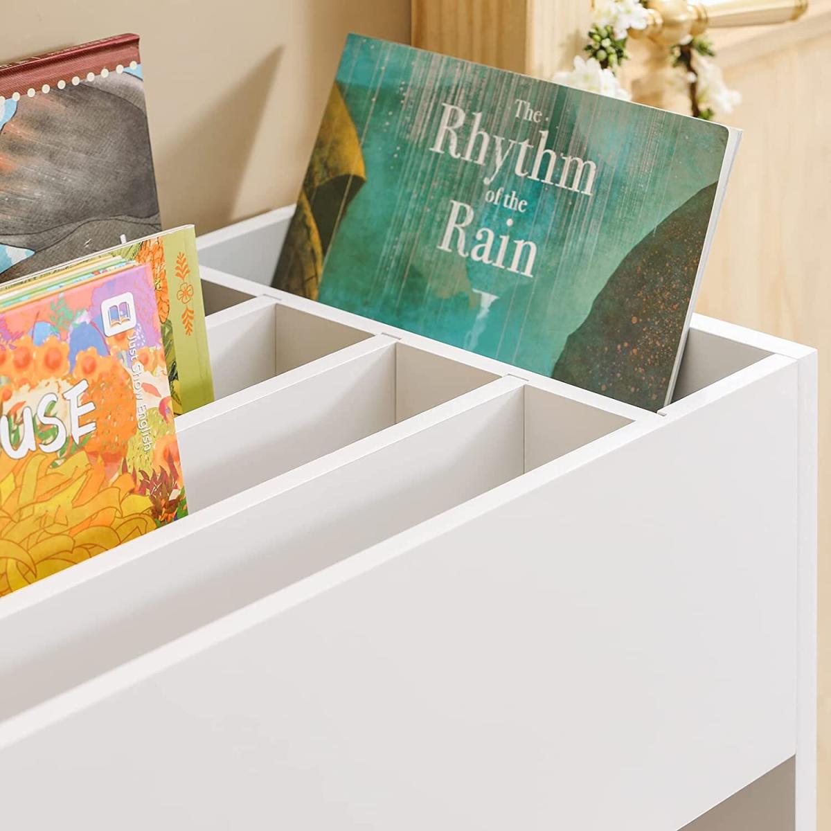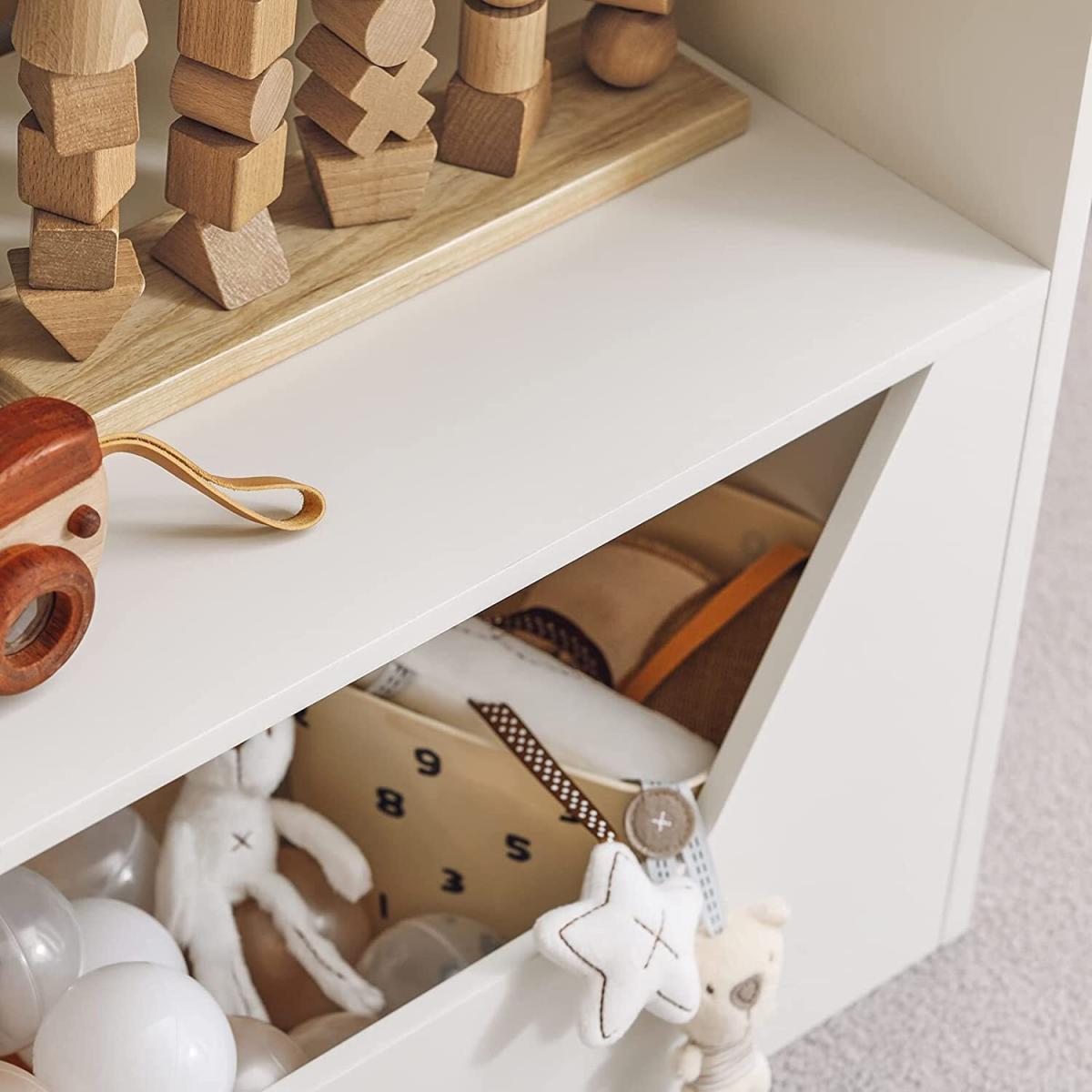 Modern design 3 tiers children storage shelf will blend perfectly with any decor. It will keep the room nicely organized. The top shelf is divided into 6 storage compartments by 5 panels, so children's books can be sorted by topic. The 5 panels are removable. You can adjust the distance to meet your needs or simply remove the shelves. The middle and bottom shelf offers additional storage space for the books and toys. Made of high quality MDF in white lacquer. Stable and durable. Suitable for children ages 3 and up, promotes organization and reading skills. Sturdy wood with environmental protection paint and the anti-tipping device, ensure good stability and safety, an ideal choice for daycare, classroom and children's room.