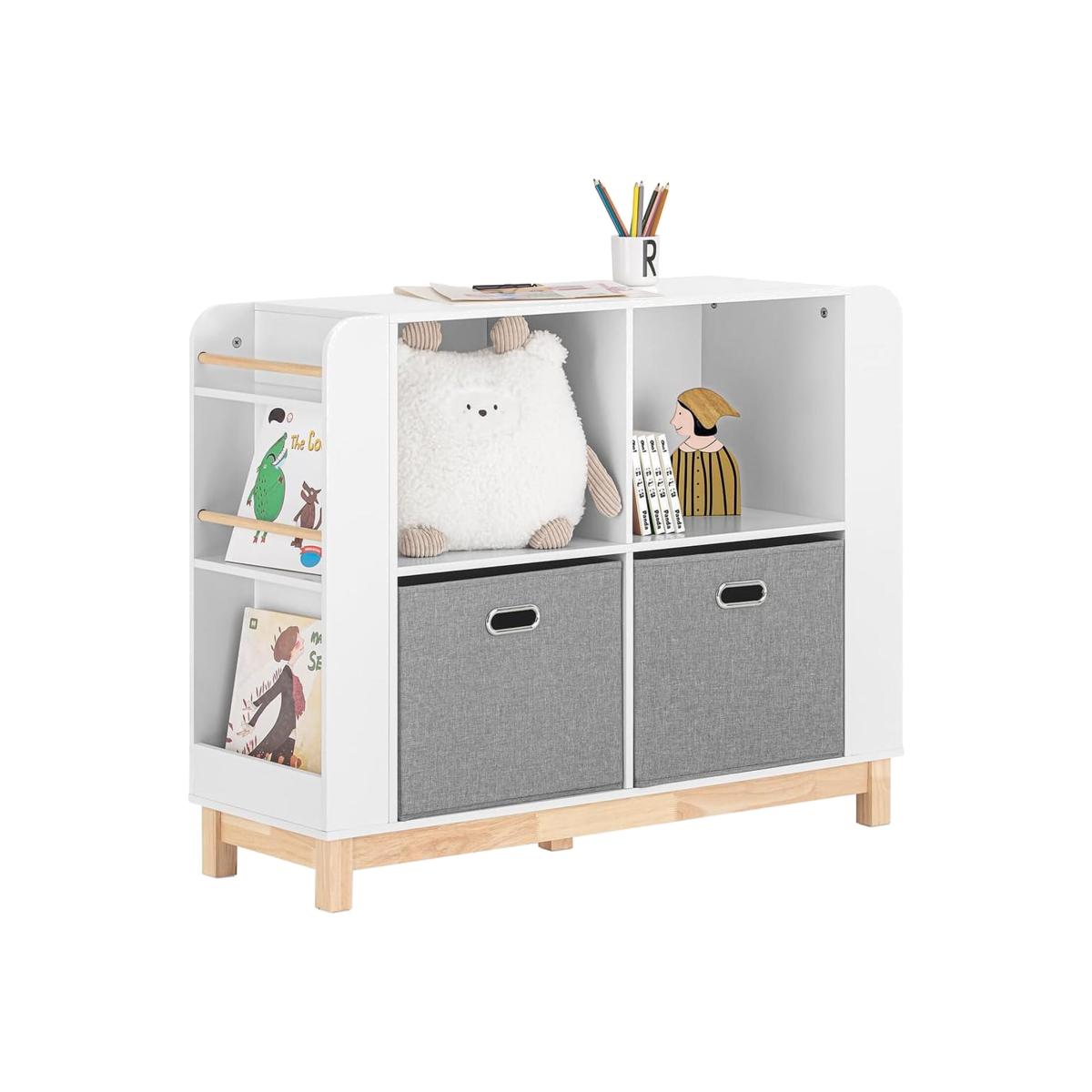 Modern design children storage unit will blend perfectly with any decor. It will keep your childrens room nicely organized. The top shelf is ideal for storing something you might need in reach, or small decorations you want to display. 2 open compartments and 2 fabric boxes provide ample storage space for the books and toys. 2 fabric boxes can be pulled out completely as a great storage solution. 6 shelves (3 on each side) offer additional storage space for you. 4 round wooden sticks (2 on each side) will prevent the items from falling to the ground. Made of high quality MDF in white lacquer. The legs and 4 round sticks are made of rubber wood with varnished coating. 2 boxes are made of non-woven fabric in grey. Sturdy and stable. Suitable for children ages 3 and up, it can help your kids develop a good habit of organizing. Sturdy wood with environmental protection paint and the anti-tipping device, ensure good stability and safety, an ideal choice for daycare, classroom and children's room.