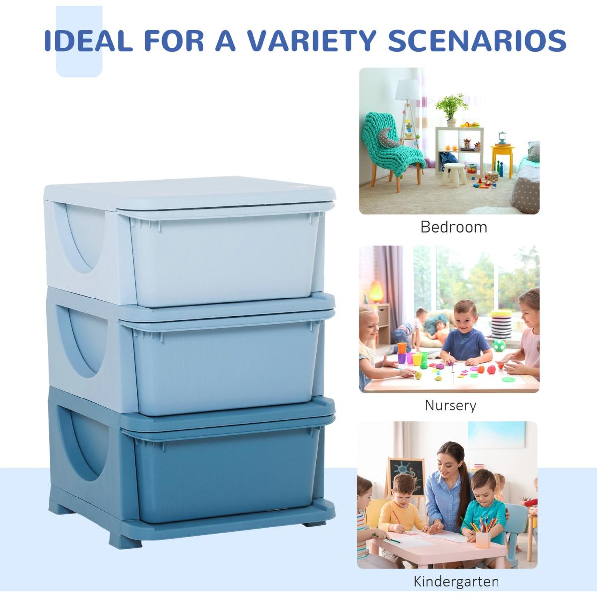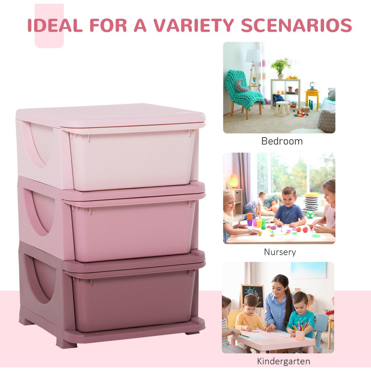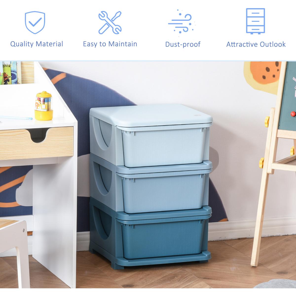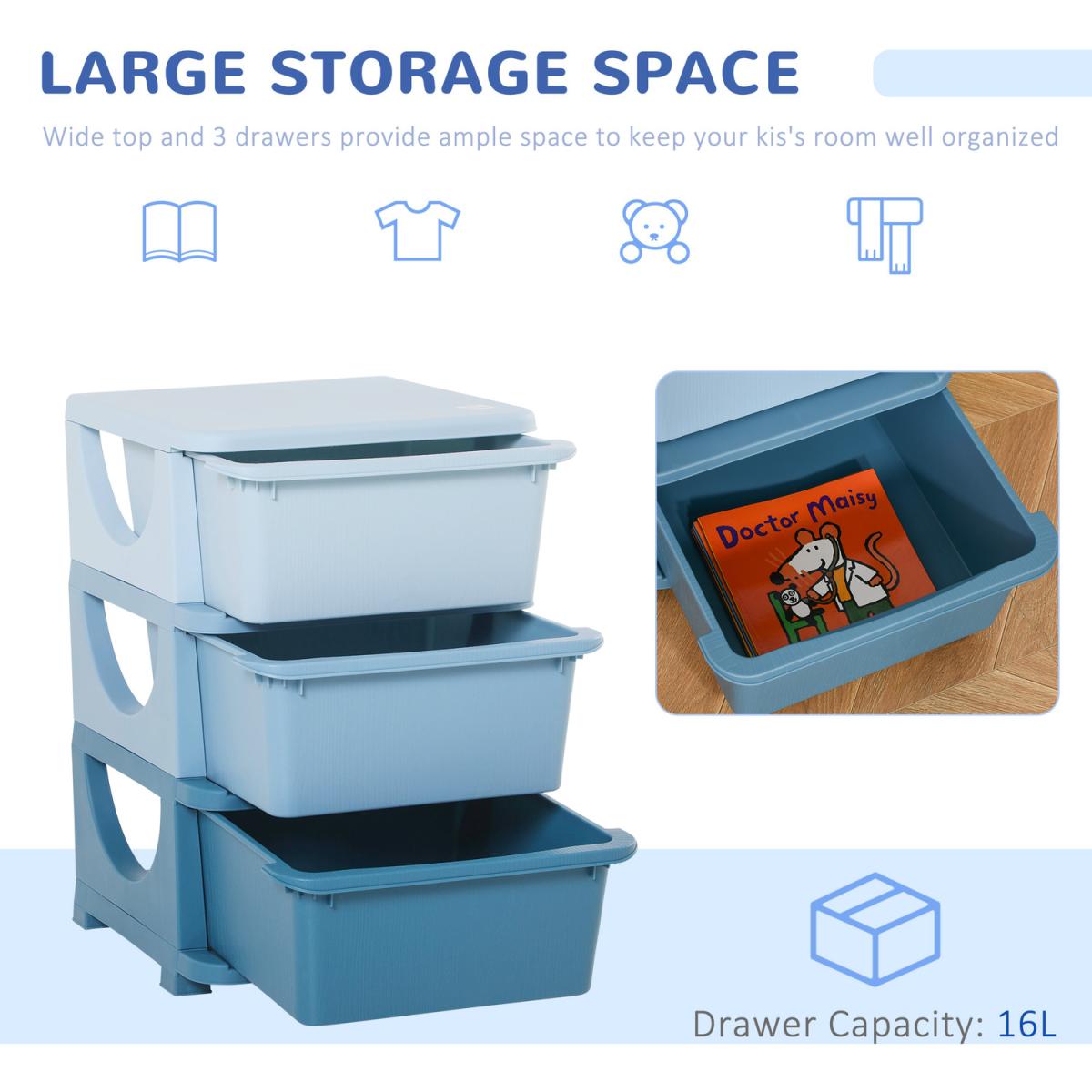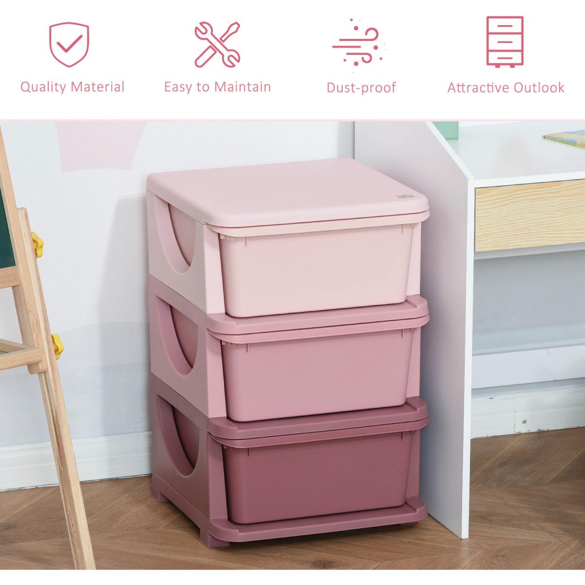 Getting them to keep home tidy is as easy as one, two, three with this storage drawer from HOMCOM. Made from quality PP material, this unit is tough so it's suitable for daily use. It features three differently coloured drawers, so there's plenty of storage space for toys, books and more. The surface is smooth so it wipes clean easily, with rounded corners to prevent any accidents. Finished with a base and stump feet so it keeps balanced. Suitable for ages 3-6 years.