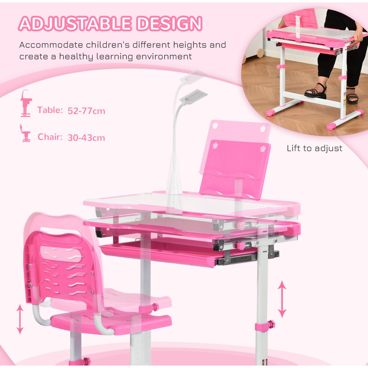 Their own space for endless activities, thanks to this HOMCOM kids table and chair set, which is great for homework, playing, art projects, reading and enjoying meals. A high backrest and footrest for comfort, whilst the adjustable chair and table will perfectly suit their height - the tabletop is also adjustable, preventing poor posture. There's a USB lamp with three colour temperatures, so their eyes don't strain. A must-have for every child, a place to learn, have fun and get creative.