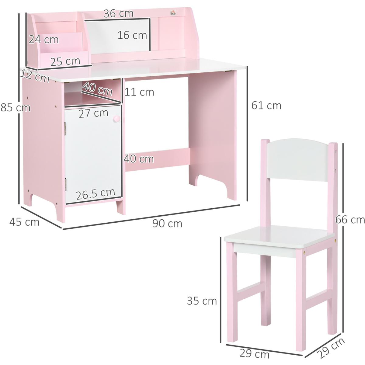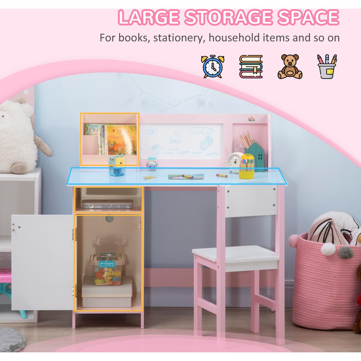 With this HOMCOM table and chair set, children have their own space to read, study, eat and play - they'll use the included whiteboard to draw and get creative. It comes with multiple storage spots, so they can organise their things, keeping their space tidy and free of clutter. Made from durable MDF and pinewood, the round edges stop kids from hurting themselves, creating a safe environment. Its matching design provides a stylish look, making a great addition to any room.