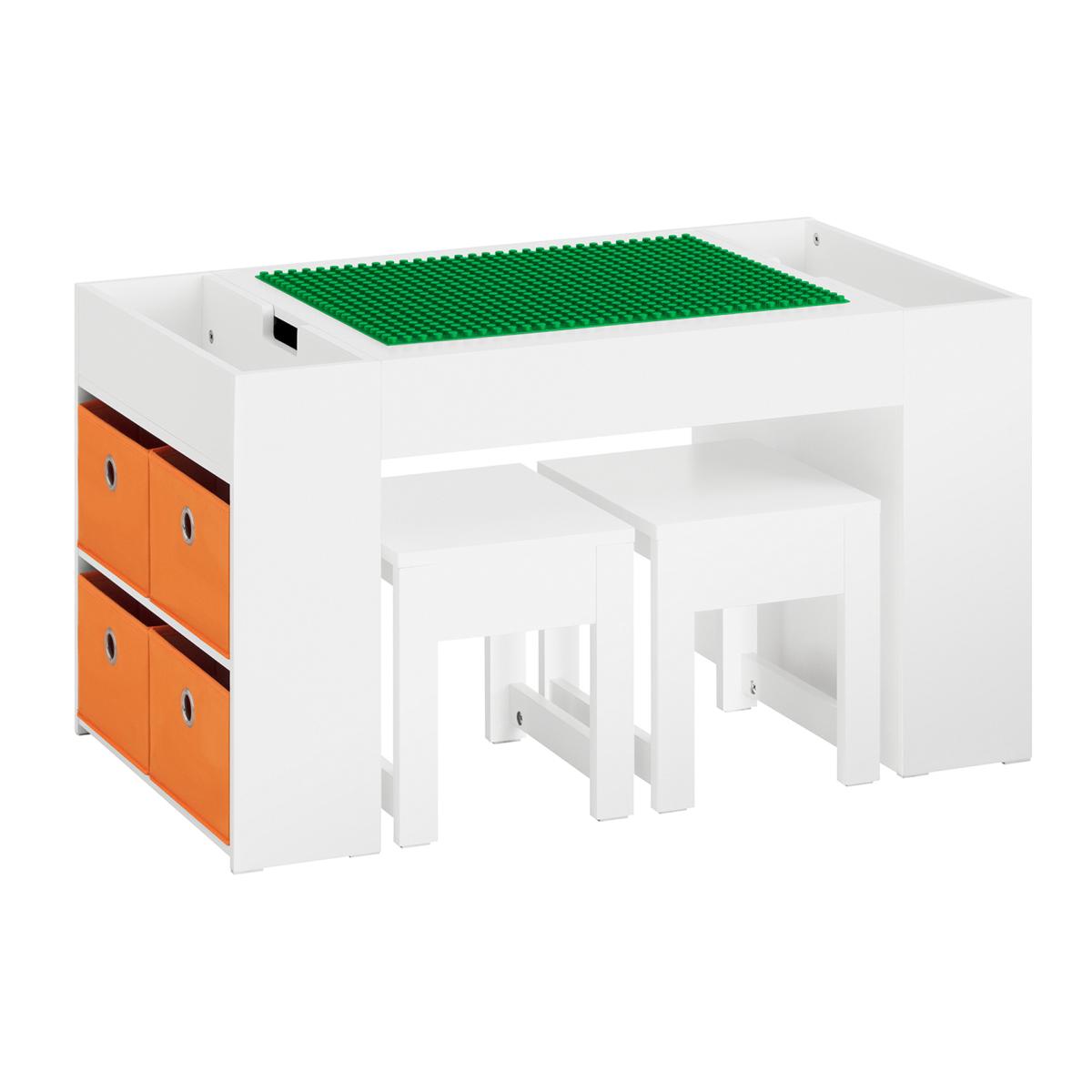 Multifunctional table set is ideal for drawing, learning, playing, eating and other activities. Children can get both a smooth tabletop for eating, drawing and writing and a tabletop with 768 large studs for playing with building blocks.8 storage boxes are made of non-woven fabric, 4 are yellow and 4 are orange. The decorative elements are not included in the delivery.