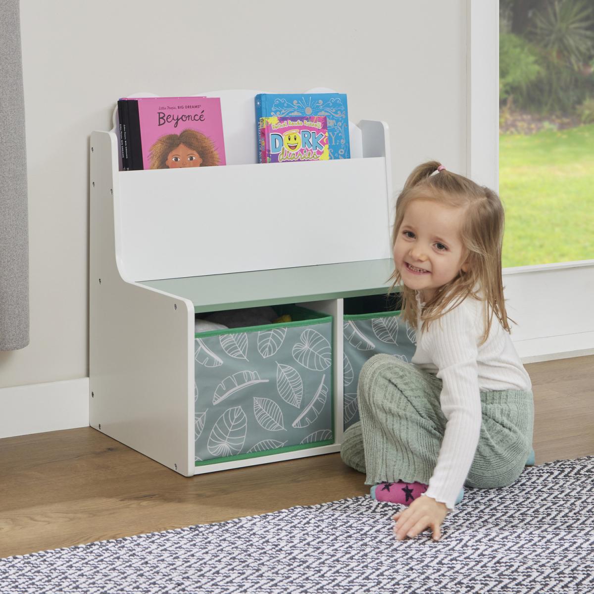Our cute Teddy Bear bookcase is designed for optimum function in a small space. Combining seating, a bookshelf and two fabric storage boxes this one compact unit provides a practical and useful space for storage of books, toys, soft toys and any other bedroom or playroom clutter. The deep bookcase compartment (200mm deep front/340mm deep back shelf) with rounded edges allows for storage of various size books and you can create a mini child's library space in your own home. The fabric storage boxes have a lovely leaf motif to add a calming and nature inspired look to your room aesthetic.