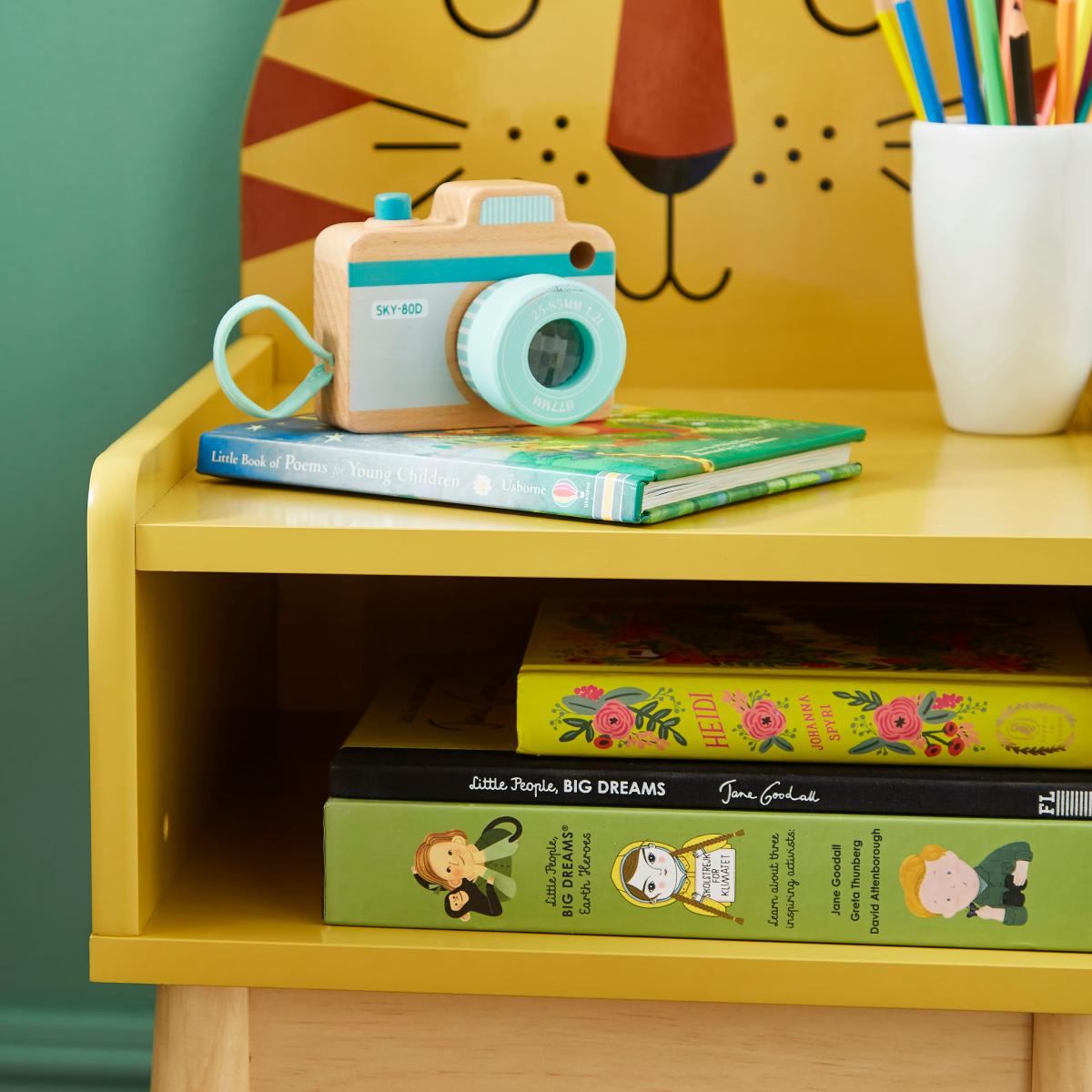 This bold yellow tiger bedside table is a fun statement piece that injects personality into a child's room, making it perfect for lively, playful interiors. It works particularly well in contemporary or eclectic spaces that embrace colour and whimsy. To style it effectively, consider pairing with neutral or pastel bedding and accessories to let the table stand out, while adding playful decor like plush animals or colourful books on top. Practical tips include using the open shelf for books or a small lamp, keeping the surface clutter-free, and mixing in natural wood or soft textiles to balance its vibrant hue. It’s ideal for creating a cheerful and inviting atmosphere in any kids' bedroom.