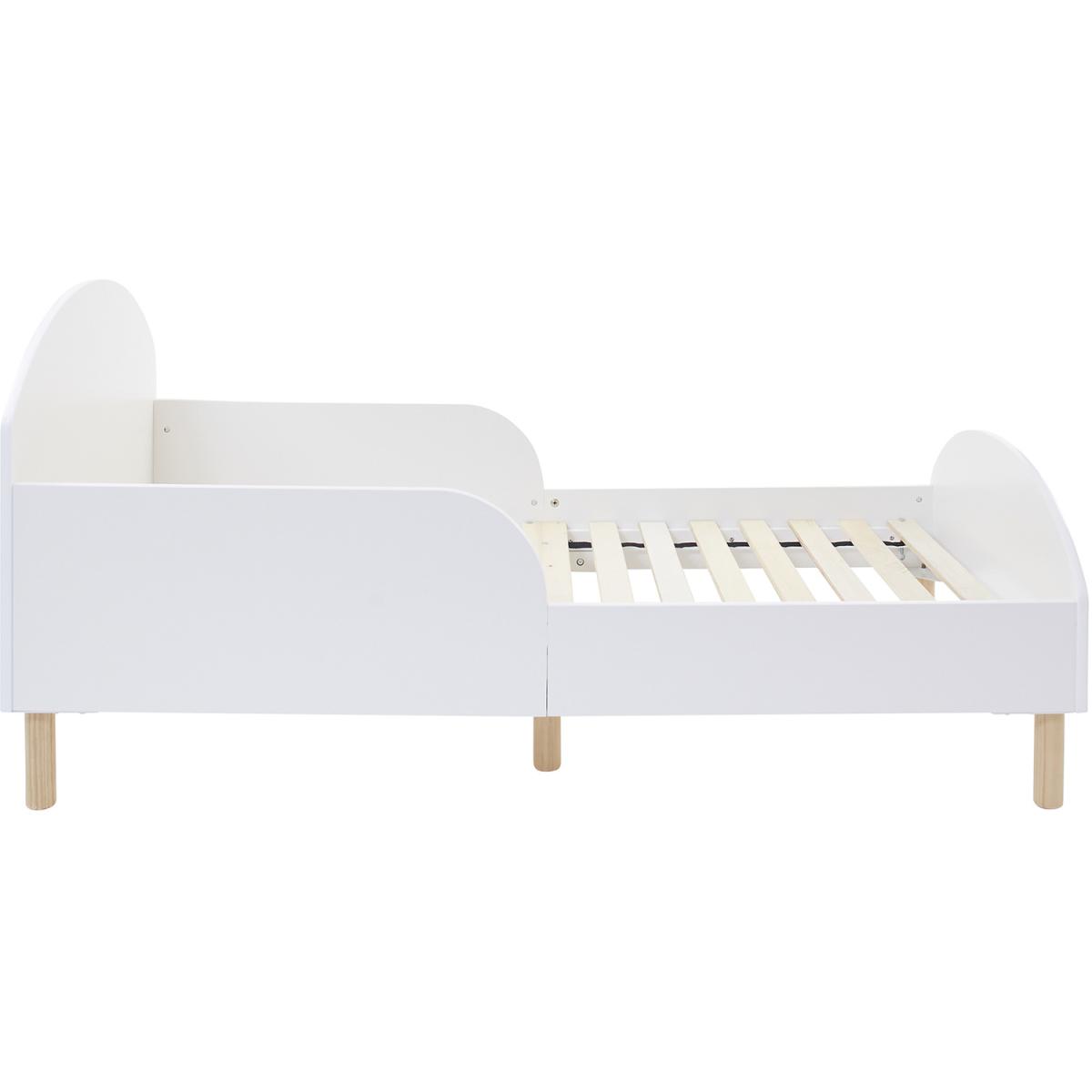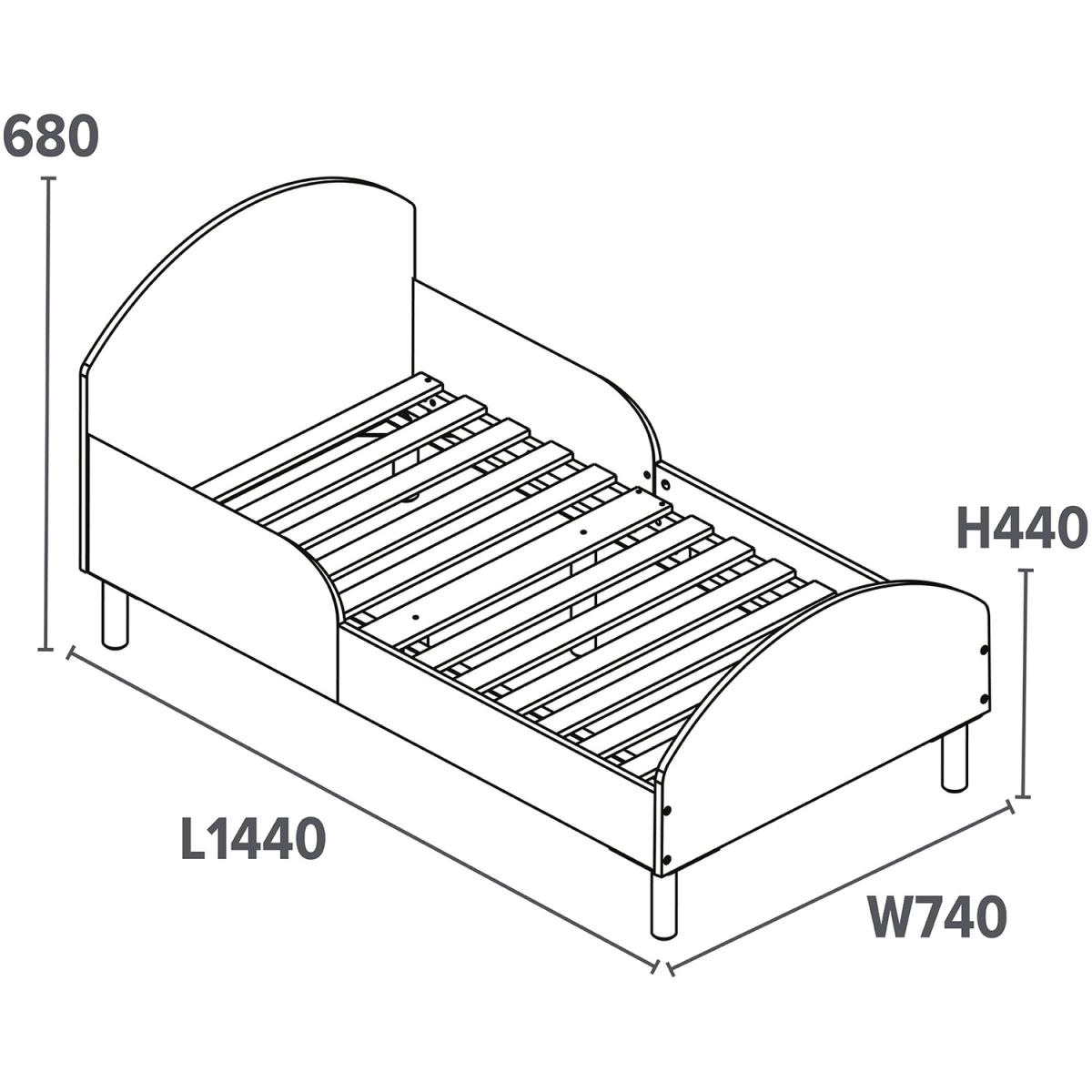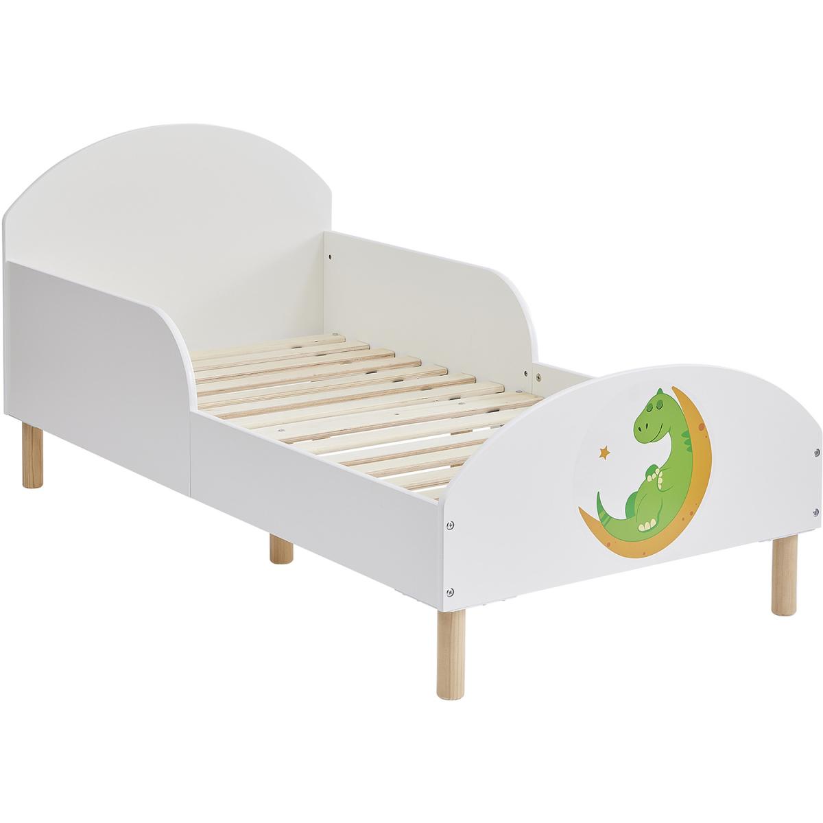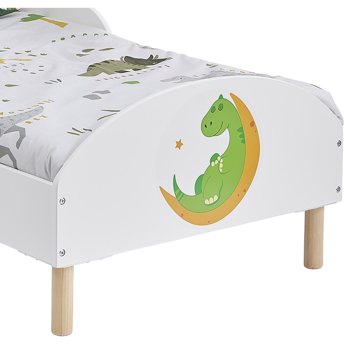 With an enclosed top frame and a modern rounded headboard your child will make an easier transition to their new bed as they are reminded of the snug confines of their cot, raised sides will stop your little one accidentally rolling or falling out of bed. Our Dinosaur toddler bed is low to the ground making it easier for your young child to get in and out of bed safely. With a strong wood frame and round pinewood legs our Dinosaur toddler bed is well made, and the all white frame means this bed is easily accessorised with the bedding of your choice, the perfect canvas to create the bed of your little ones dreams. This Toddler Bed is supplied with a digitally printed sleepy Dinosaur decal and will fit perfectly into your dinosaur themed bedroom.