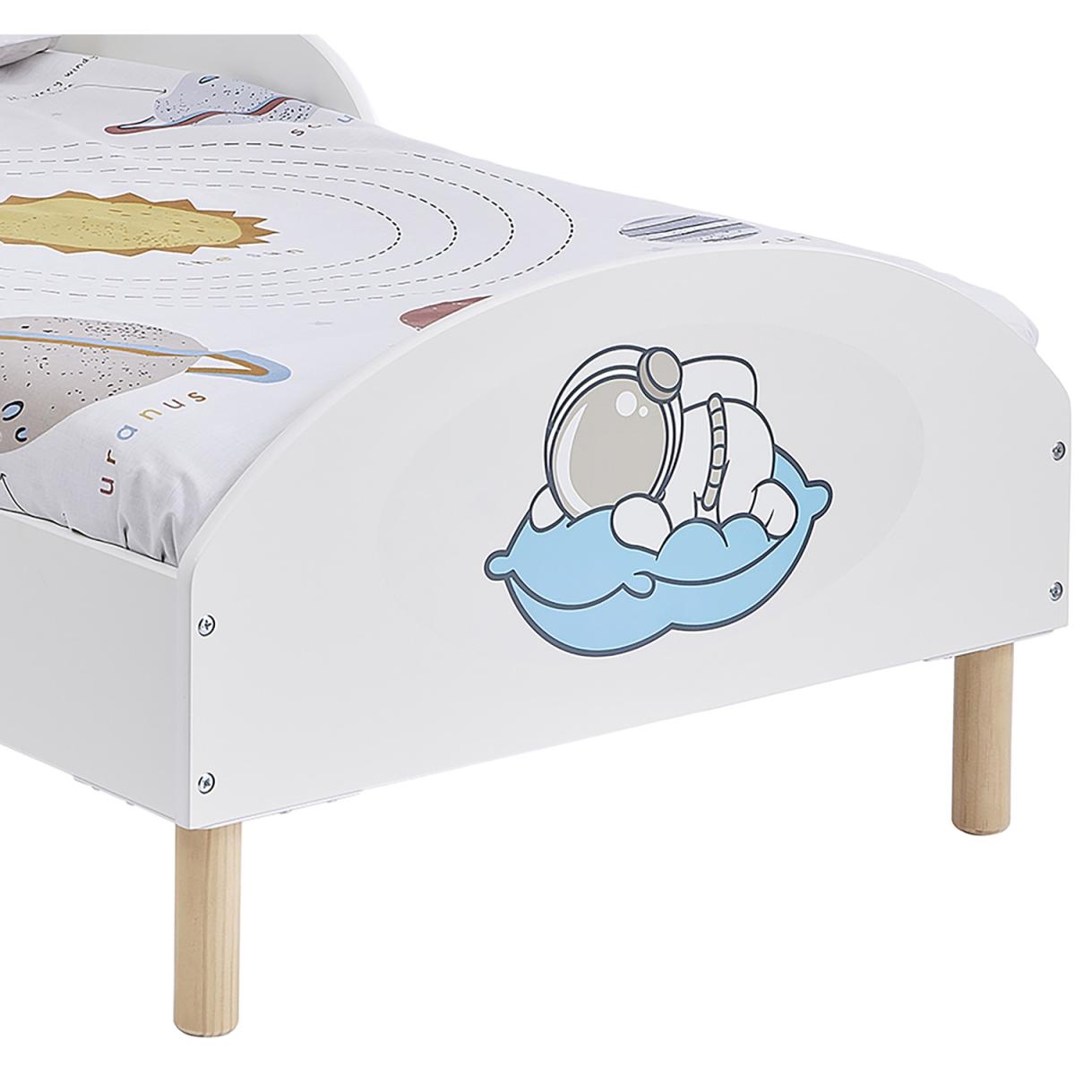 With an enclosed top frame and a modern rounded headboard your child will make an easier transition to their new bed as they are reminded of the snug confines of their cot, raised sides will stop your little one accidentally rolling or falling out of bed. Our Spaceman toddler bed is low to the ground, making it easier for your young child to get in and out of bed safely. With a strong wood frame and round pinewood legs our Spaceman toddler bed is well made, and the all white frame means this bed is easily accessorised with the bedding of your choice, the perfect canvas to create the bed of your little ones dreams. This Toddler Bed is supplied with a digitally printed sleeping Spaceman decal and will fit perfectly into your space themed bedroom.
