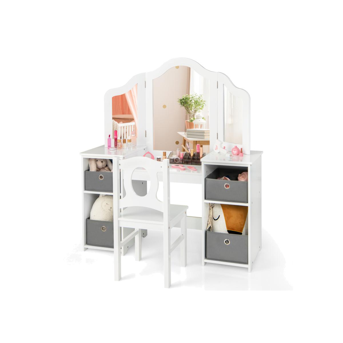 Introduce versatility to your child's space with our 2-in-1 kids vanity desk set. This multi-use kids' table and chair set caters to activities like dressing up, reading, and drawing. Featuring ample storage with open compartments and removable bins, it keeps your child's essentials organised. The shatterproof tri-folding mirror offers safety and functionality, enhancing their grooming and play experiences. Safety is prioritised with an anti-toppling device and rounded corners for worry-free fun.