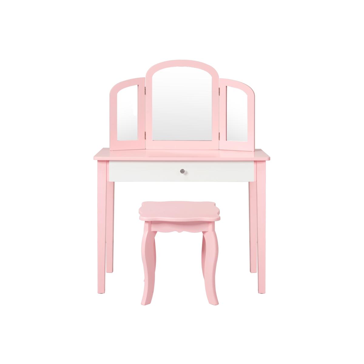This kid's vanity set is a perfect present for your little girl! Made of thick boards and solid wood legs, the whole vanity set is very sturdy and can be used for a long time. The tri-folding mirror allows your kid to adjust the angle of the mirror conveniently to make up better. The mirror can be removed and the table can also be used for writing or reading. Plus, the acrylic mirror is shatterproof and safe to use. The dressing table comes with a large drawer to store small items such as hair ties, brushes, makeup, nail polish and other fun trinkets.
