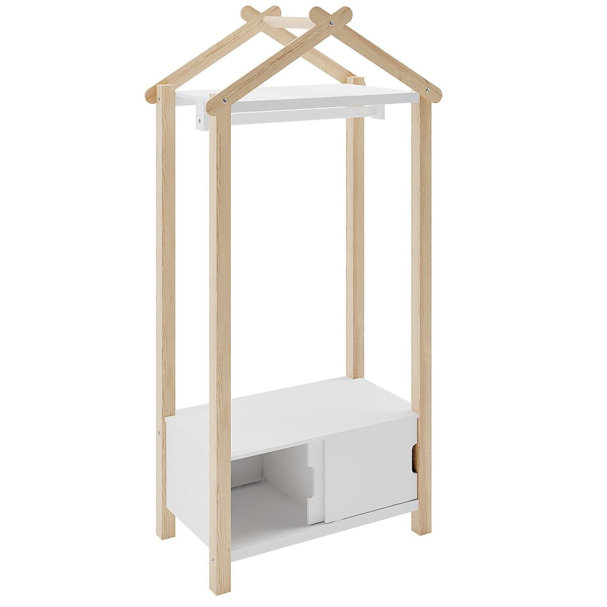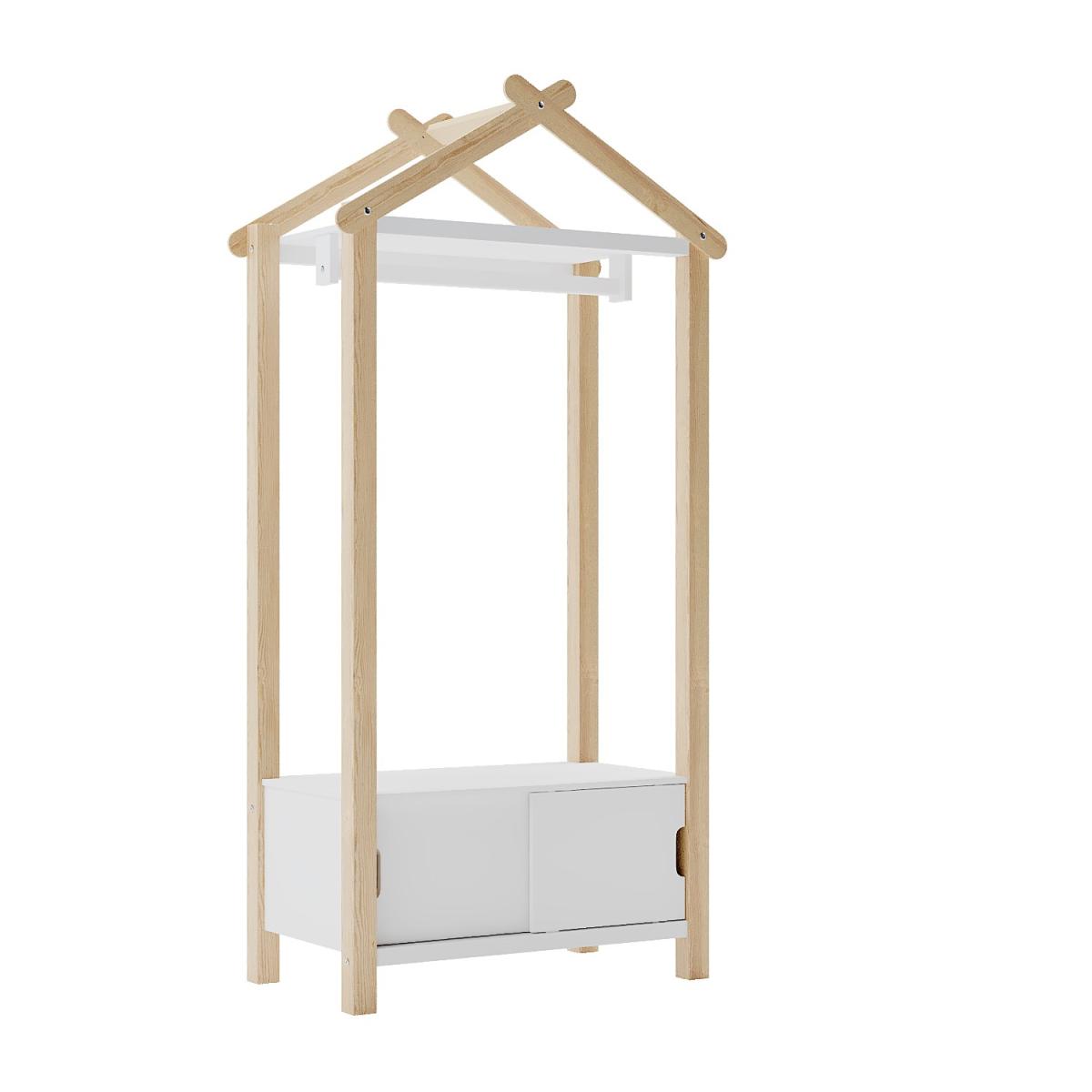 Features we love Kids' house-shaped open wardrobe in a Scandi design Sturdy wooden build with white and natural pine finish Sliding-door cupboards are perfect for extra storage Great for small spaces with no doors to swing out Complete the look with the matching Mylo pieces All about me The Mylo house-shaped wardrobe features an open hanging rail for clothing, plus a handy shelf and two cupboards to store shoes and accessories. Positioned in a kids' bedroom or a nursery, the cut-out handles are ideal for little hands. Complete this set with matching pieces from the Mylo children's bedroom furniture collection. Need to know Dimensions:W90 x D50 x H180 cm Weight: 29.9 kg Packed dimensions:W55.2 x D10 x H159 cm Number of cupboards: 2 Cupboard dimensions: W37 x D41 x H28 cm Colour: White and pine Finish: Painted Material: Solid pine and MDF Assembly required: Yes