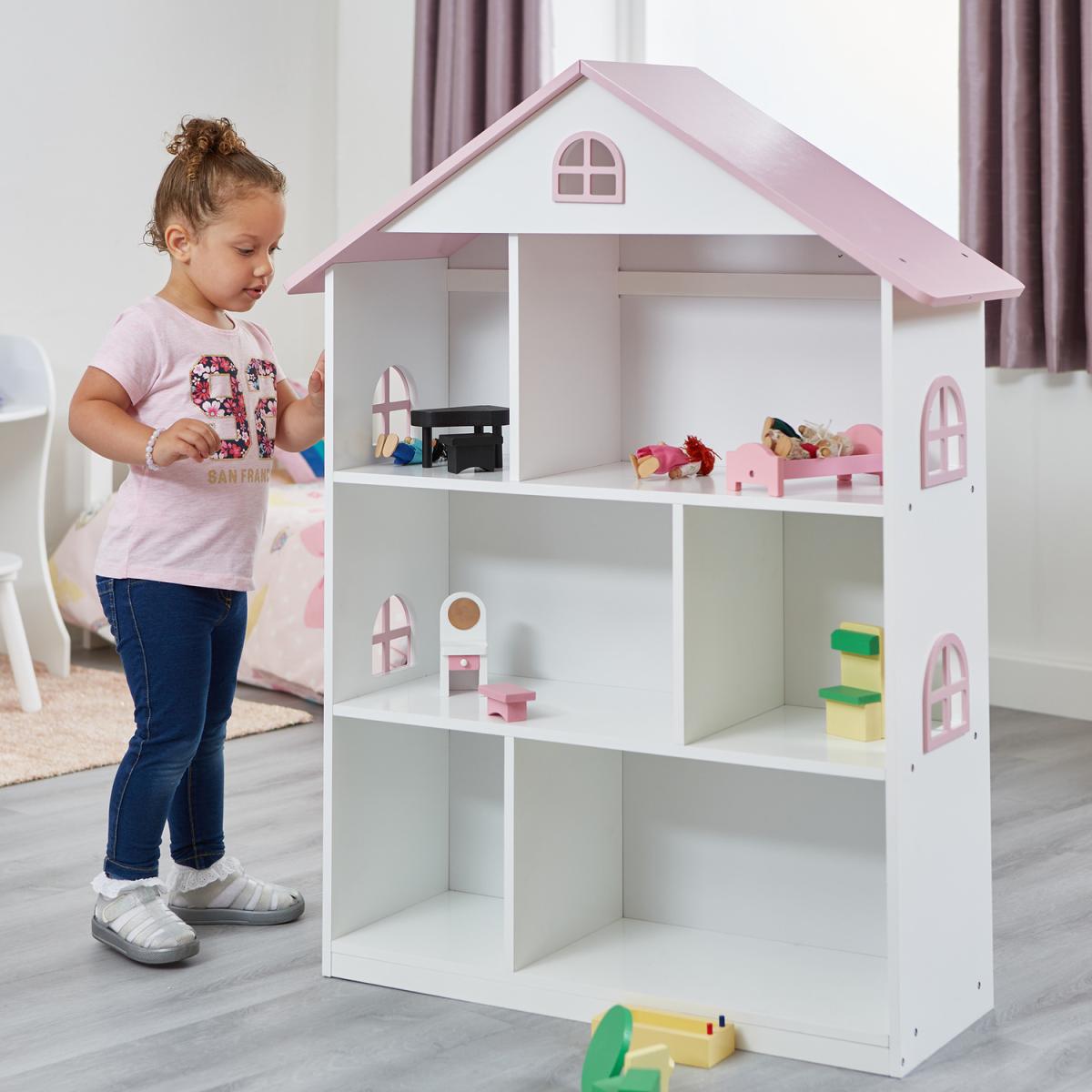 Enjoy the best of both worlds with our Kids White Dolls House Bookcase with Pink Roof. This unique bookcase is a lovely alternative to children's standard storage solutions. It combines practical storage with the option for playtime rolled into one. This dolls house bookcase includes 5 windows and a roof. Also includes 6 compartments, 3 small and 3 big. This unit is ideal for storing dolls, small toys, books and so much more. Comes flat packed with easy to read instructions for quick assembly. Any accessories shown are not included unless stated.