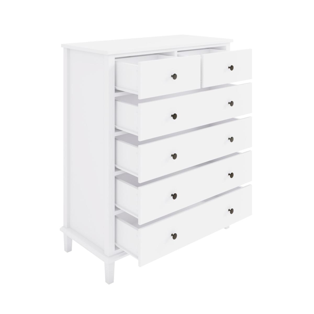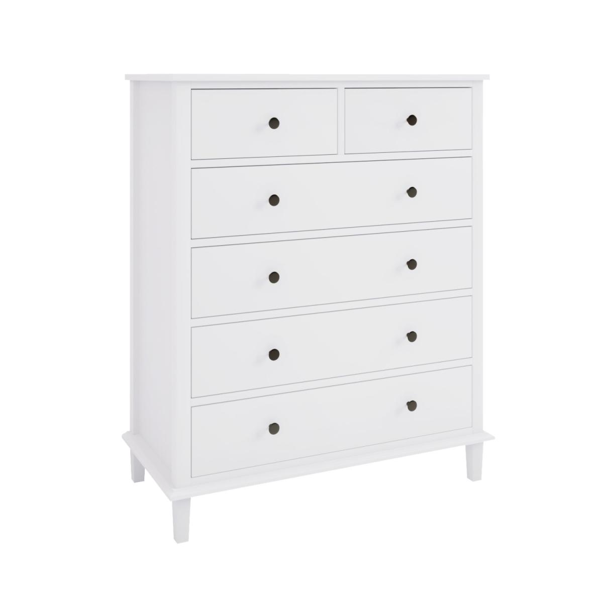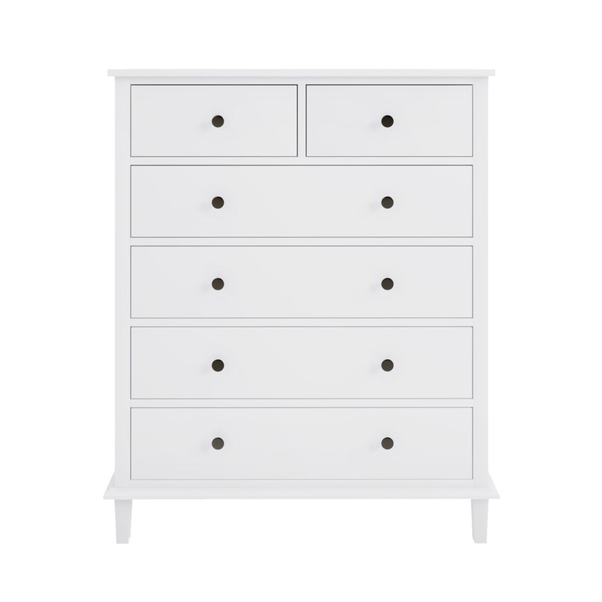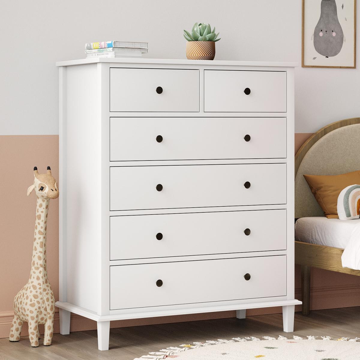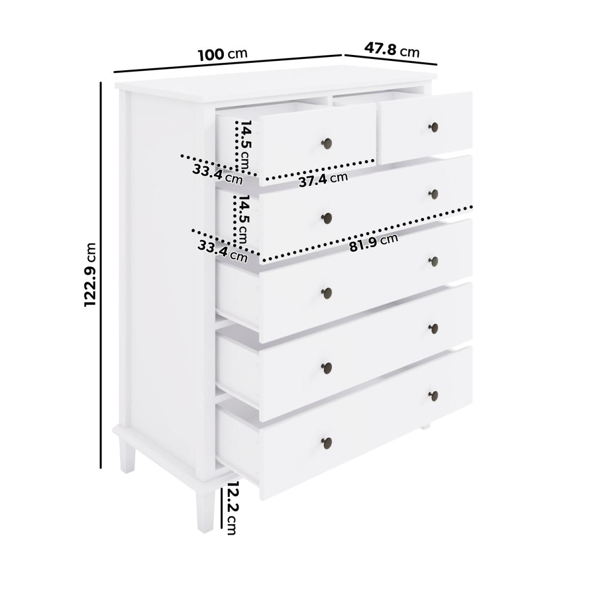 All about me The Marlowe range has an understated design that will compliment any kids interior décor schemes. Its characterised by clean edges and simple lines, finished in pure white which brings a sense of light and space to the bedroom. This six-drawer chest is durable and visually appealing with its clean and classic aesthetic. It's been crafted from solid wood with a fresh white painted and lacquered finish. Housing three full width drawers and two smaller drawers there's plenty of space to store and organise folded items. The drawers have durable wooden runners and have been finished beautifully with simple knob handles in shiny chrome. The surface top comes in handy for a bedroom TV or dresser space to display perfume bottles and trinkets. Need to know Product dimensions: W100 x D47.8 x H122.9 cm Base to floor height: 12.2cm Small drawer dimensions:W37.4 x D33.4 x H14.5 cm Large shelf dimensions:W81.9 x D33.4 x H14.5 cm Product weight: 40.8kg Number of drawers: 6 (2 small, 4 large) Colour: White Finish:Painted and antique brass (handles) Material: Solid pine wood (front, sides, top), MDF (back, drawer bases) and metal (handles and runners) Assembly required: Yes Packaging dimensions: W118 x D53 x H18.5 cm Packaging weights: 43.4kg