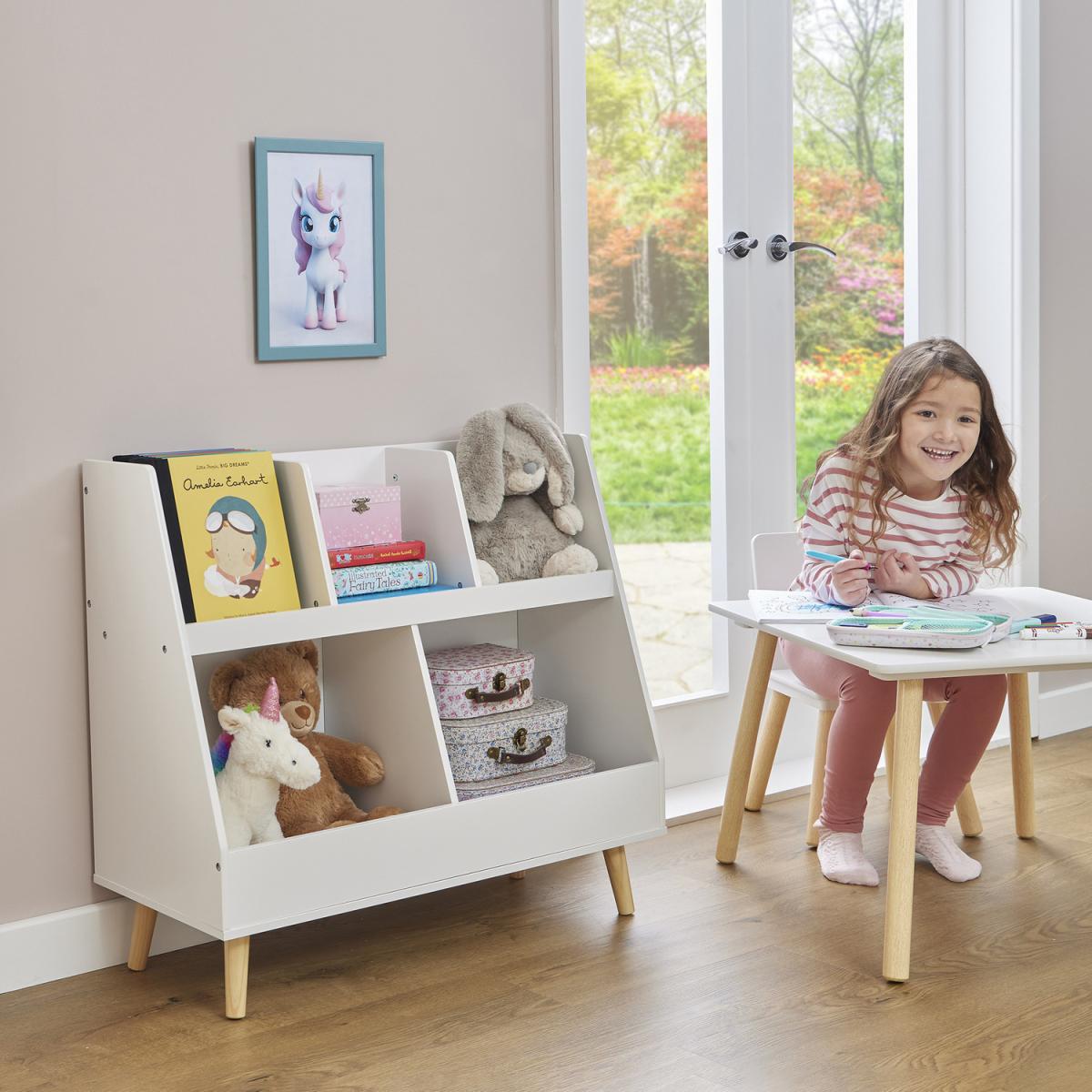 I really like this sloping bookcase for its simple, Scandi-inspired look and child-friendly height - it’s ideal for bedrooms, playrooms or a corner of the living room where little ones need easy access. The white finish and natural wooden legs work equally well in modern, minimalist or coastal-style schemes, while its angled shelves double as a display area for storybooks and soft toys. To style it, mix forward-facing picture books on the top tiers with woven baskets or fabric boxes below to keep small items tidy. You could also add a low-profile play mat in front, so it becomes part of a cosy reading nook, and swap in seasonal toys or art supplies as your child grows.