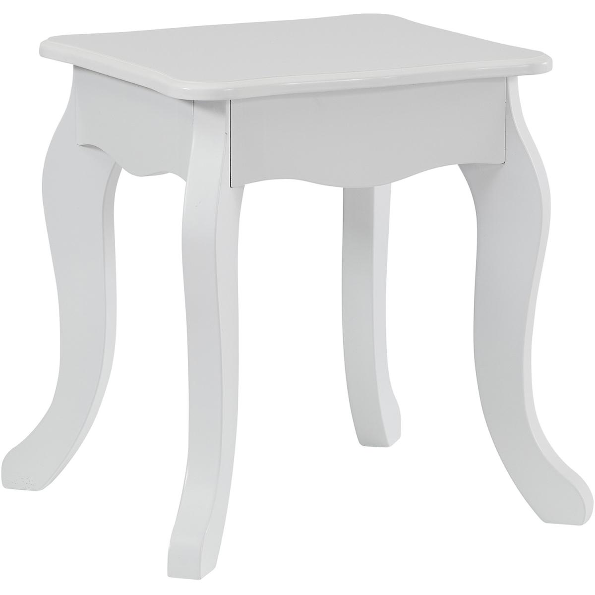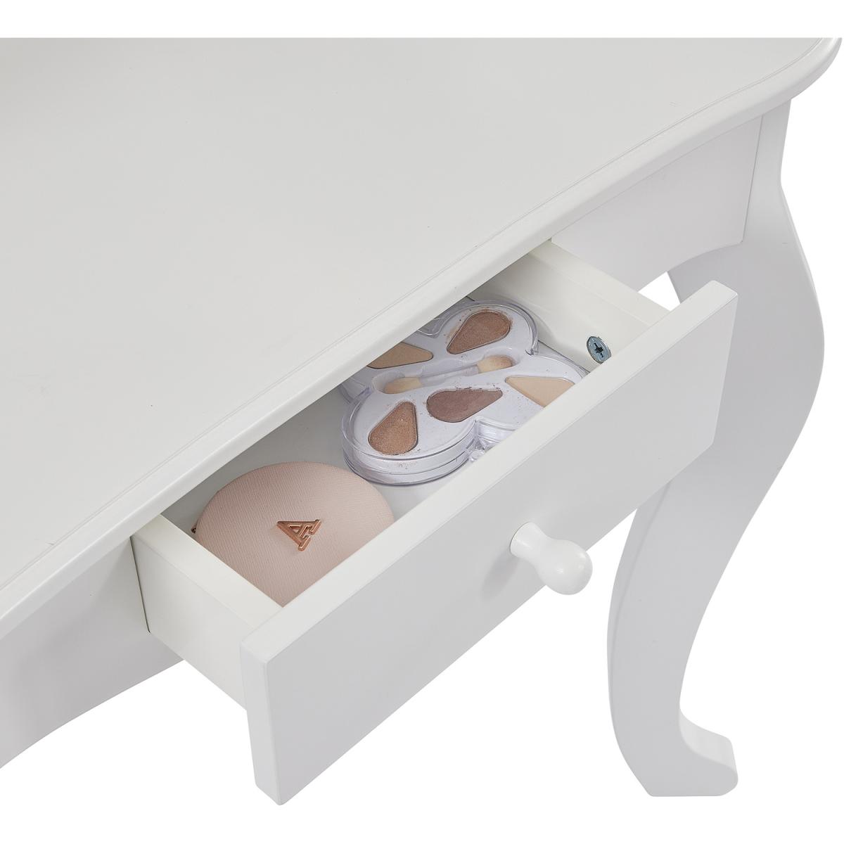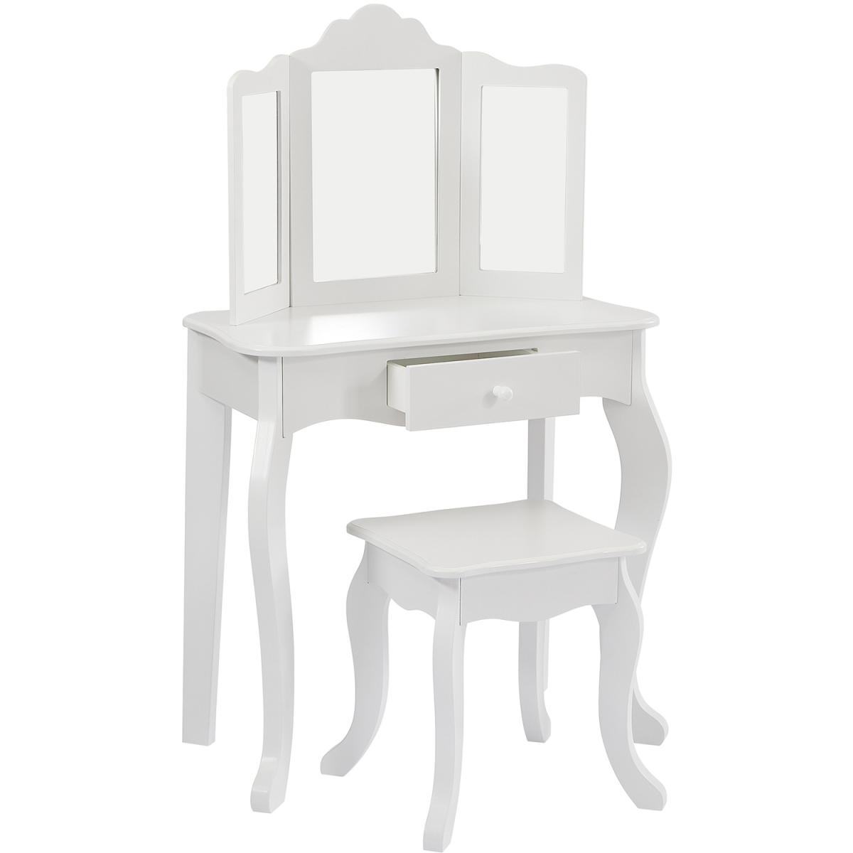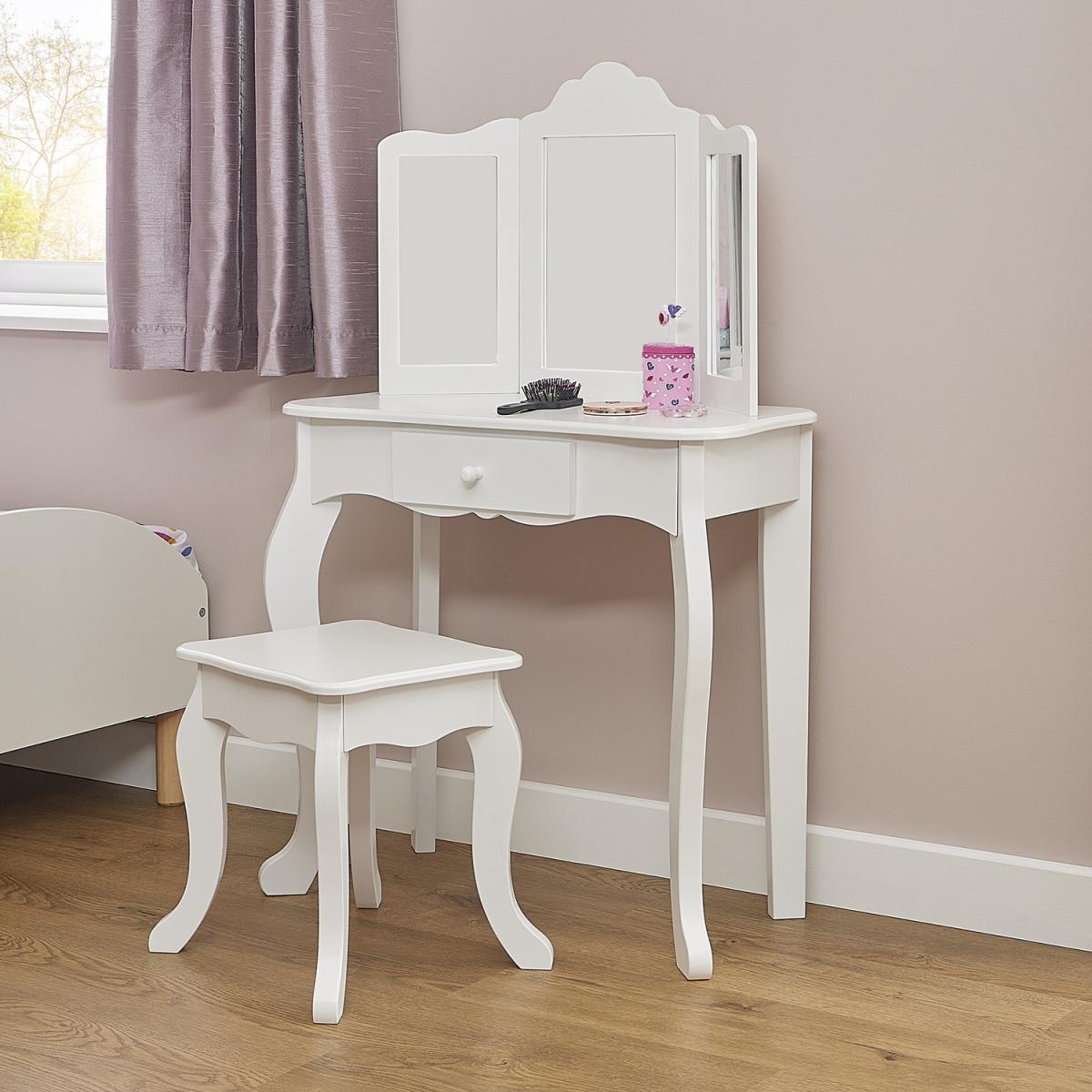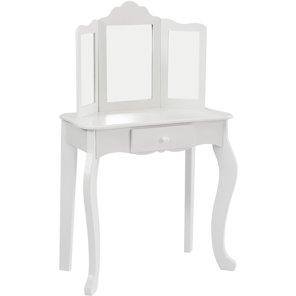 Liberty House Toys striking all white kids vanity table and stool set features stylish scalloped edging and is a beautiful addition to any childs bedroom. With toughened safety glass mirrors to ensure your child stays safe, the three mirrors provide for a full panoramic view when grooming, applying make-up, or doing your hair. A large central pull-out drawer is ideal for storing make-up, brushes, jewellery, and other accessories all in one easily accessible place. Your young child will love engaging in role play with their new vanity table.