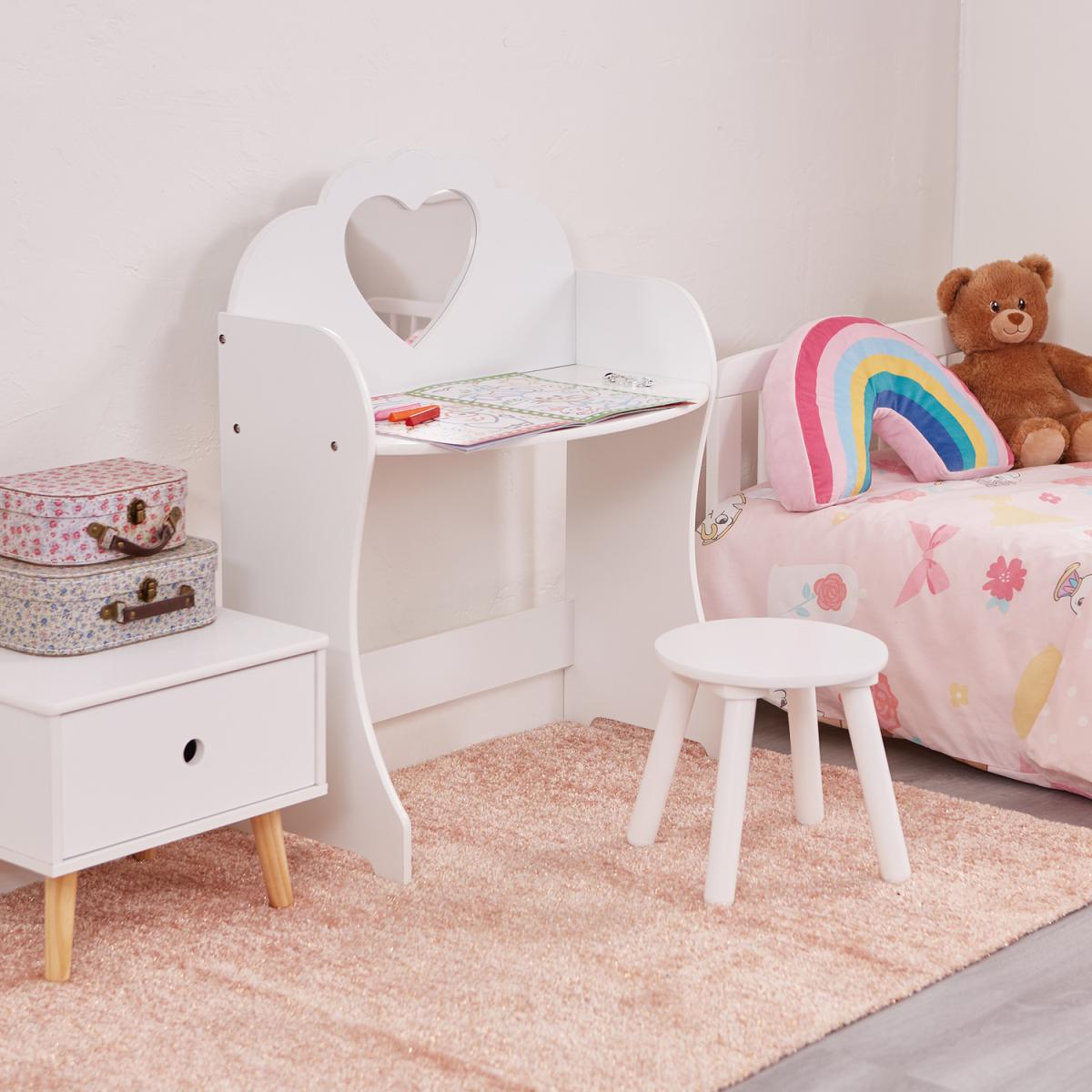 This compact white wooden dressing table and stool set is a practical and charming addition for a child's bedroom. I love its clean, simple design, which makes it versatile enough to fit into various interior styles, from scandi to traditional. It works especially well in light, neutral colour schemes or playful, pastel palettes to highlight its cheerful vibe. To style it effectively, consider adding a small mirror with a soft frame, some colourful storage organisers on top, and a few decorative accents like fairy lights or picture frames to make the space more engaging. Keeping the surrounding area tidy with minimal accessories will ensure it remains functional and longer-lasting as a special spot for your little one’s daily routines.