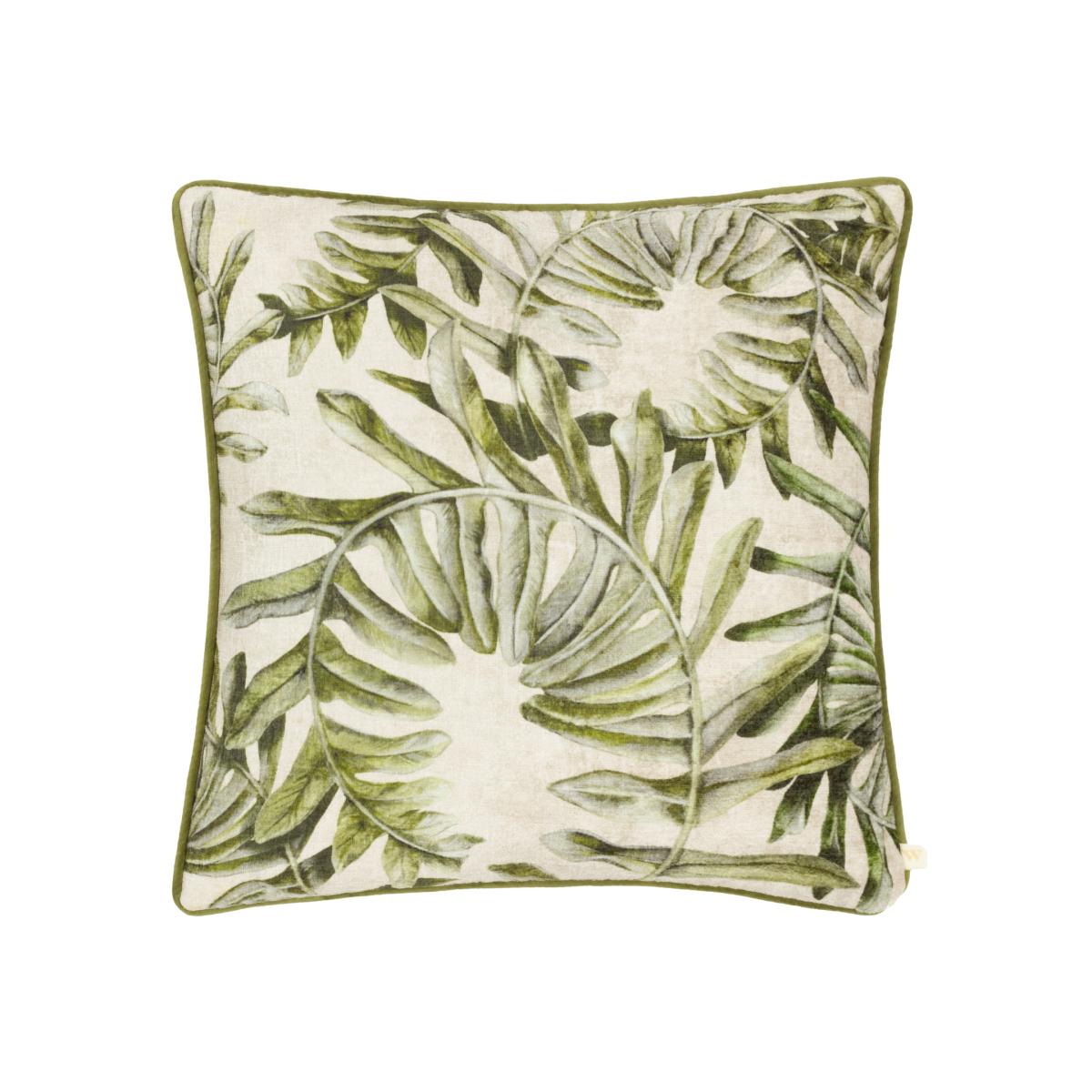 The Kielder Forest Sherwood cushion features beautifully painted close-up swirling ferns, printed on a soft, textured fabric. Backed with a plain velvet and finished with a coordinating piped trim, this cushion is designed and made in the UK, offering both elegance and quality craftsmanship.