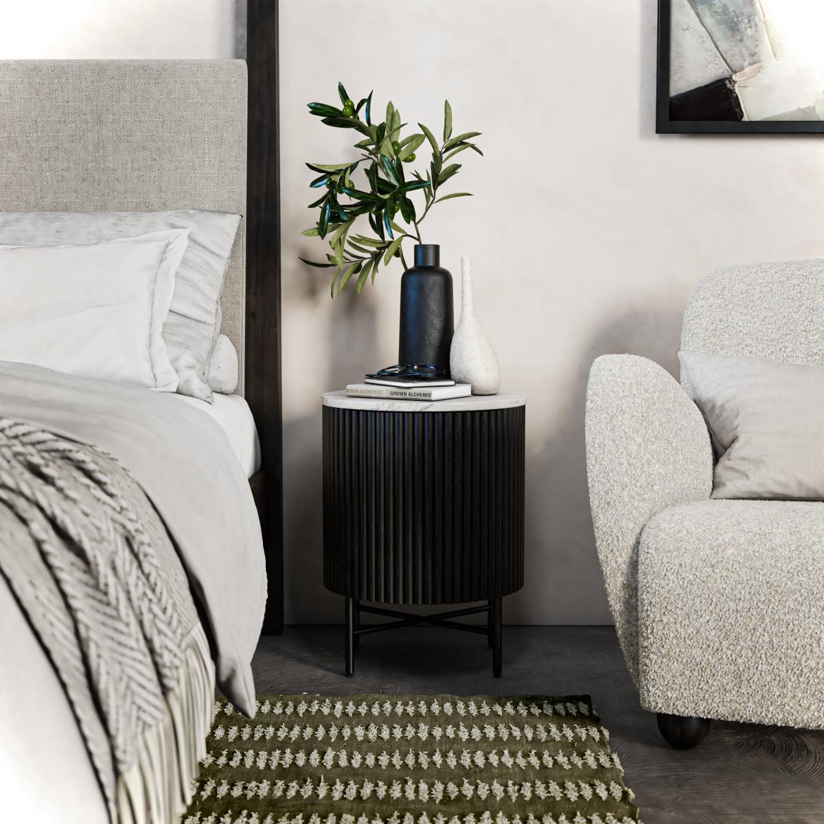 I love this Kiera bedside for its mix of warm mango wood slats and a sleek black marble top - it works equally well in Scandi-minimal, industrial or contemporary bedrooms. Its compact, cylindrical form makes it ideal for smaller rooms or asymmetric layouts. For styling, keep the marble surface clear with a slim table lamp and low-profile vase, then use the internal storage to tuck away bedtime essentials. Pair with neutral linens and a textured rug to balance the hard marble with softer fabrics.