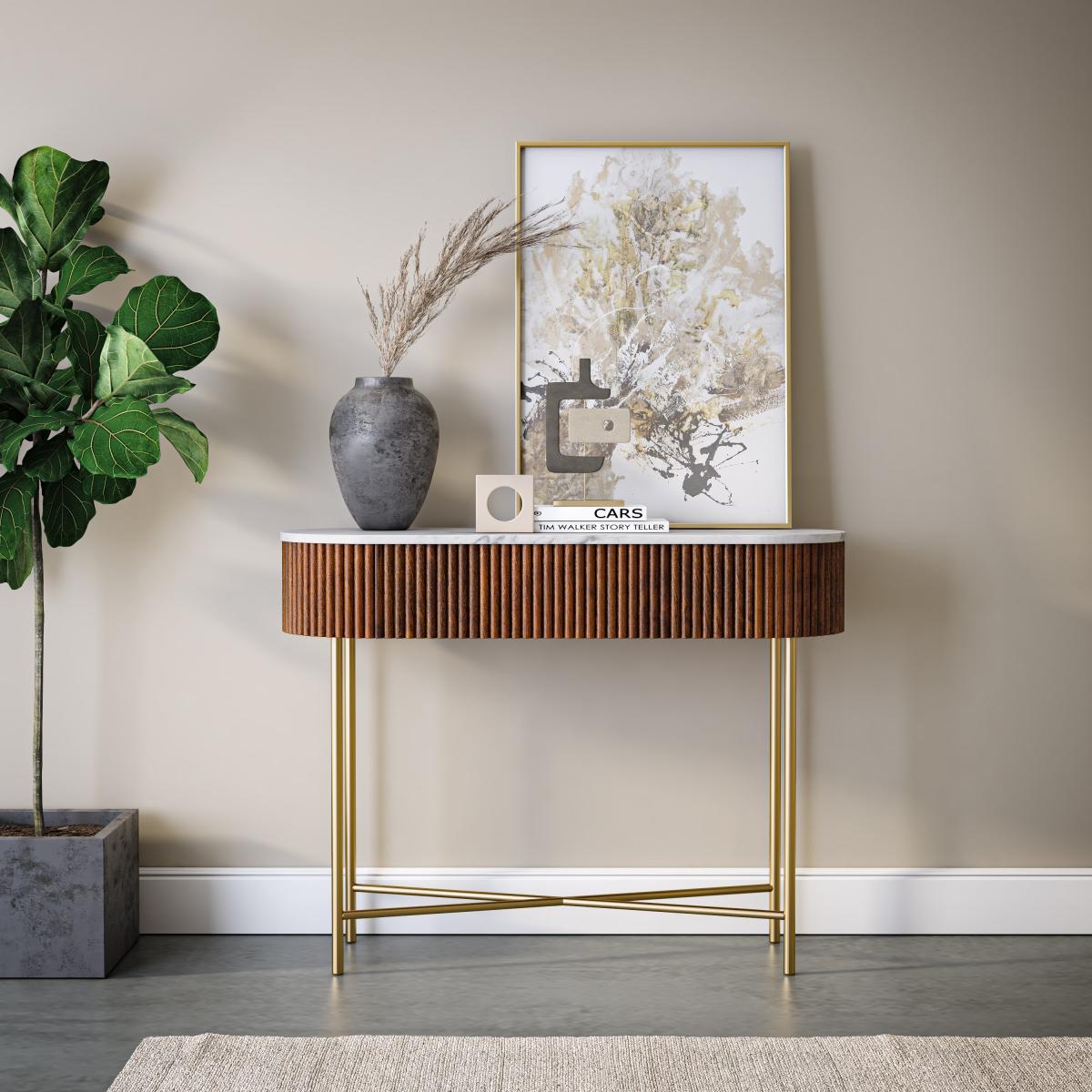 I’m a big fan of the Kiera console for its neat proportions and mix of warm mango wood, real marble top and slim brass legs - it brings both durability and lightness to a hallway or behind a sofa. It sits well in contemporary, mid-century or Scandi schemes thanks to the fluted timber detail and pared-back metal frame. To style it, lean a mirror or slim art print against the wall, add a small lamp, stack a couple of design books and finish with a sculptural vase of dried stems. Keep the colour palette muted so the walnut grain and marble veining take centre stage, and pop a woven basket underneath for extra storage.