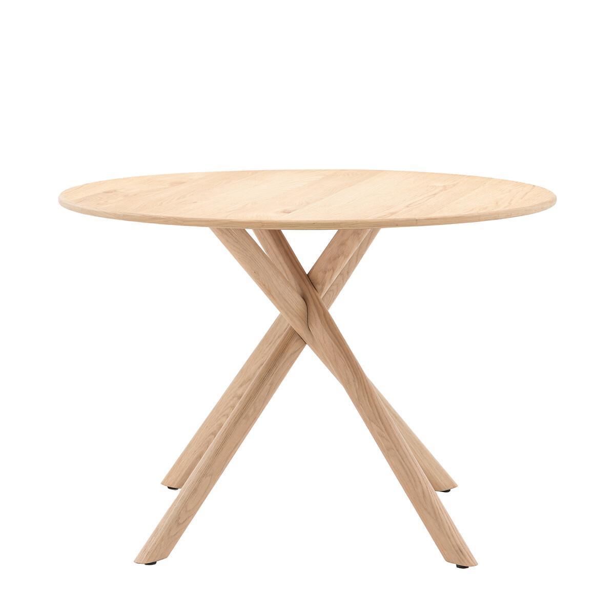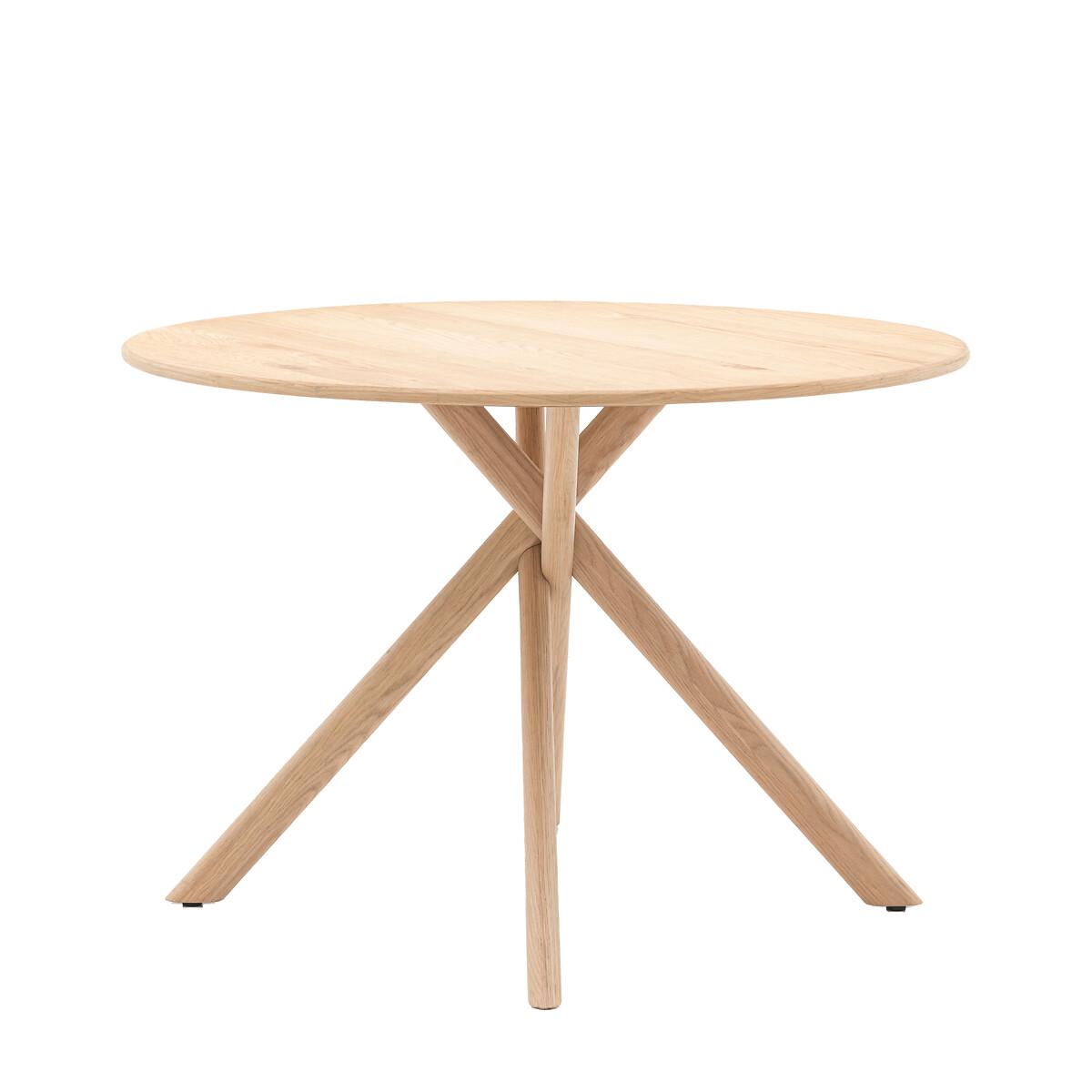 This dining table is a stylish and functional addition to any dining room. Its round tabletop and unique, sculptural base create a modern and eye-catching look. The natural wood finish adds warmth and character to your space, perfect for entertaining guests or enjoying family meals. Product Details• 4 person• Made from natural oak veneer, beautifully finished in a matte natural laquer to highlight the grain of the wood• Sculptural base tripod design base• Partial assembly required (legs/feet only)• Care advice - Wipe clean with a soft cloth• 12 months manufacturers warranty. Product Composition - MDF / Oak / Oak Veneer / Rubberwood. Product Dimensions - 110 cm x 110 cm x 76 cm, Weight - 24 KG Min. Table Length - 110 cm. Max. Table Length - 110 cm Leg Height - 72 cm Package Dimensions - 117 cm x 117 cm x 11 cm, Weight 30 KG This product will be dispatched by one of our trusted suppliers. You’ll be contacted by their selected courier about your delivery. Please note: this product cannot be delivered to all Offshore Islands, Northern Ireland or Republic of Ireland.