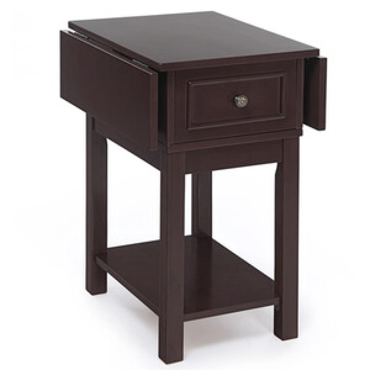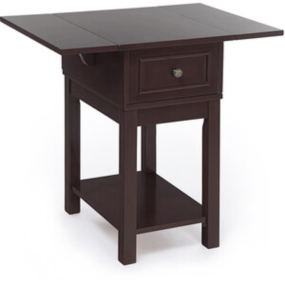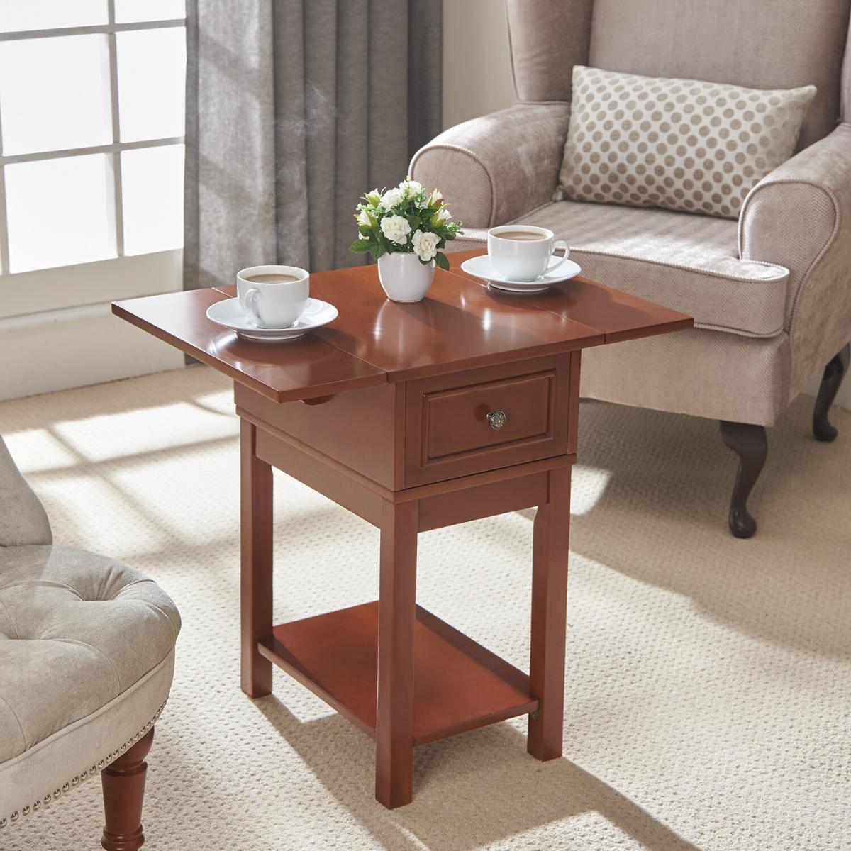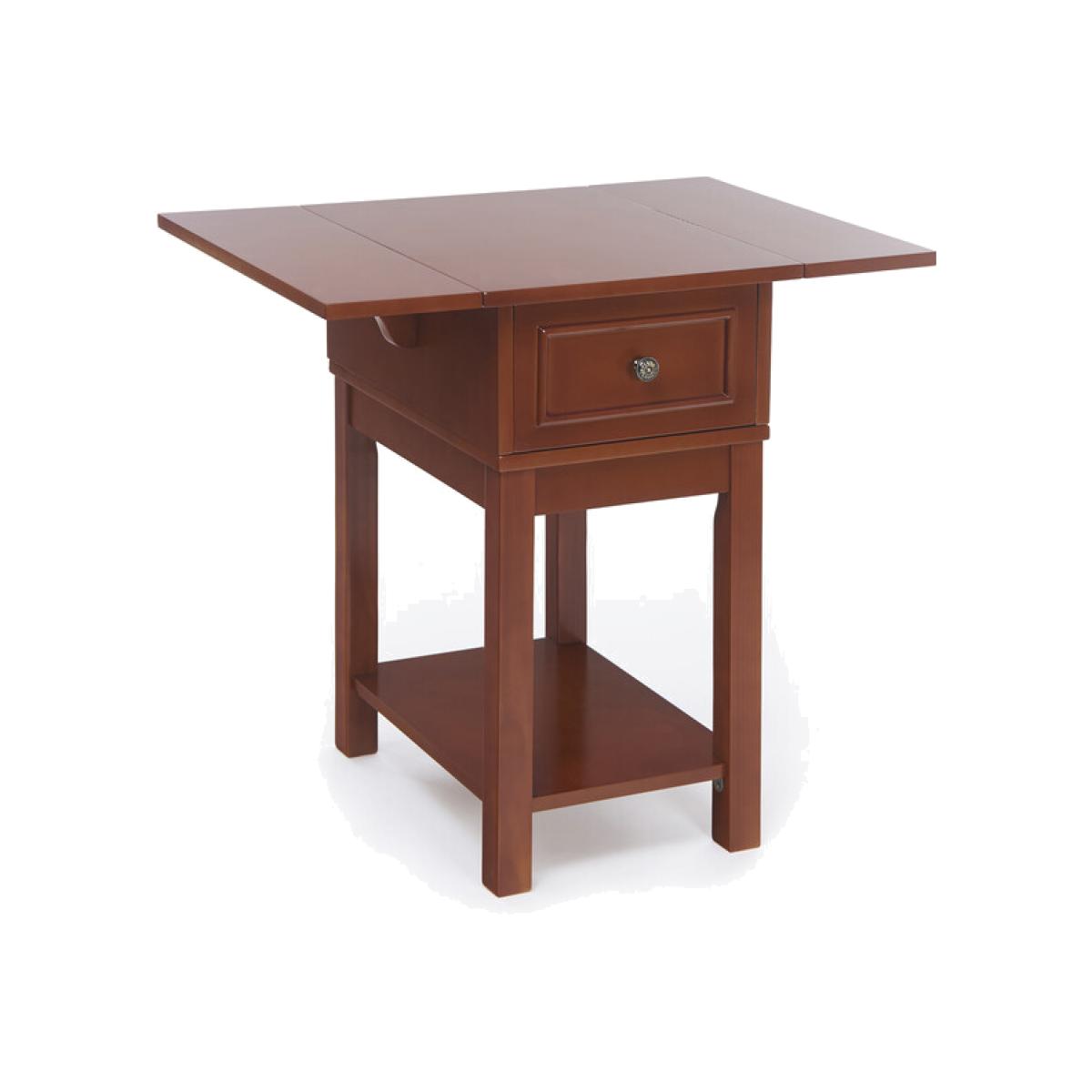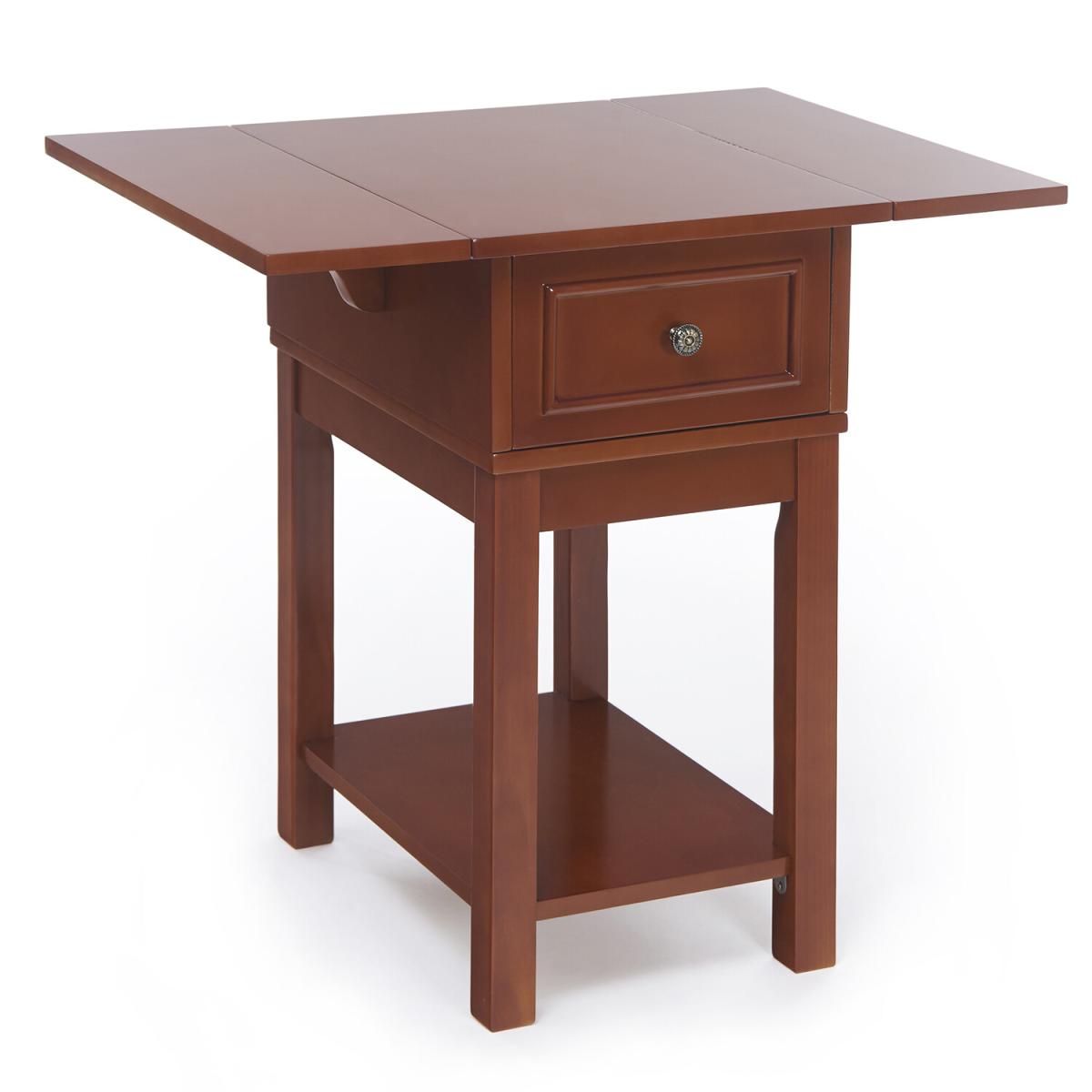 This versatile Kilburn Drop Leaf End Table is designed to fit into any bedroom or living room. The top not only offers space for a lamp clock or any other decoration, but the drawer is ideal for storing any other personal products. The table can be easily extended with its two drop leaf sides when more room is needed for playing cards or drinks. The bottom shelf gives extra storage for magazines or books. The Drop Leaf Table is manufactured from solid timber and MDF sections and is finished in a rich oak or mahogany colour. Home assembly required.