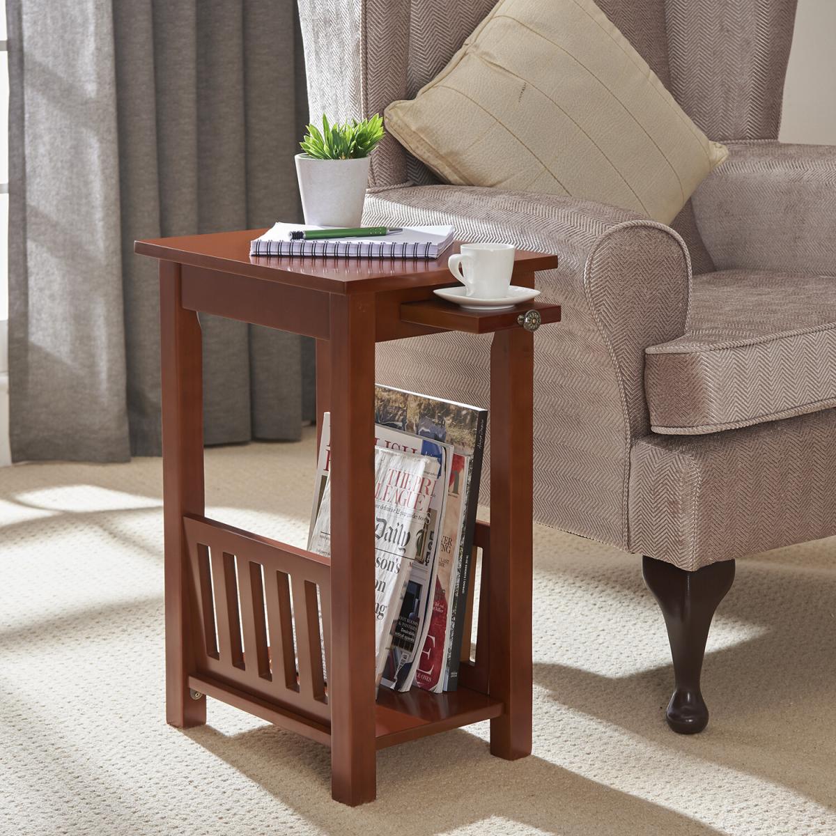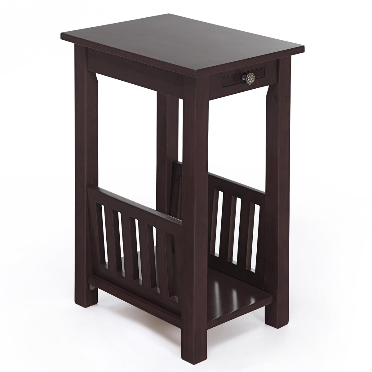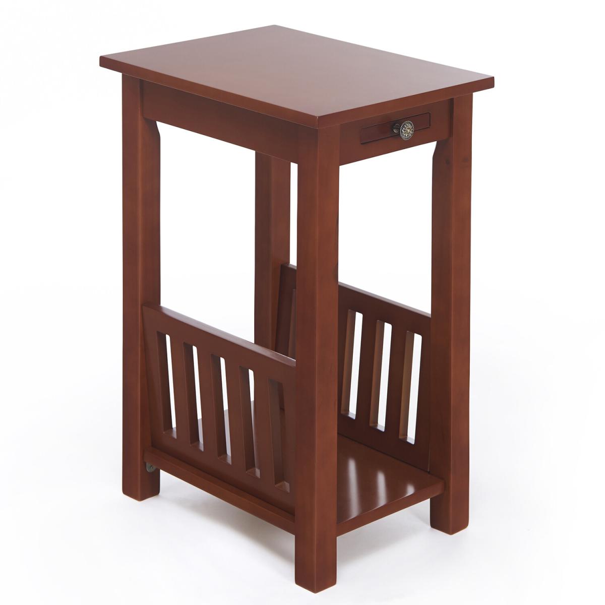This stylish End Table with Magazine Rack will look stylish in any room in the house. The End Table not only offers a magazine rack to keep your newspaper magazines and books neat and tidy but the unique pull-out tray offers a place for your drink or remote control. Made from solid timber and MDF sections and finished in either rich mahogany or oak colour. Home assembly required.