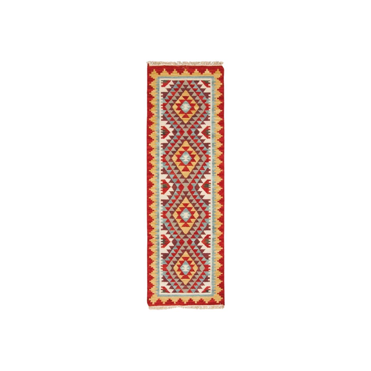 This elegant wool runner showcases a stunning geometric diamond pattern in vibrant reds, oranges, and soft blues, inspired by traditional tribal designs with longer format, perfect for hallways or narrow spaces. The rich colors and traditional kilim weaving technique create a stunning path of warmth and artisanal beauty that brings character to any corridor or entryway.