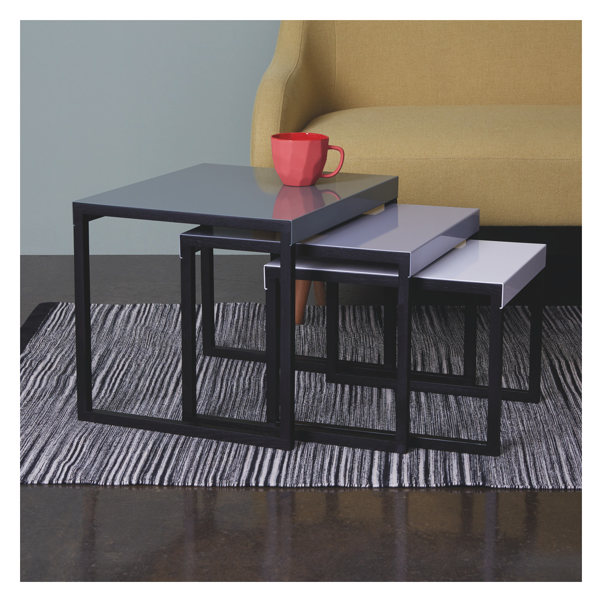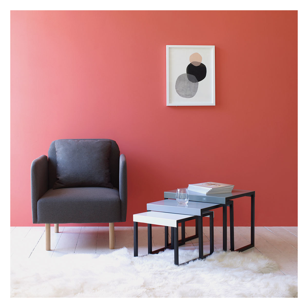 The Kilo nest is a versatile and lightweight set of side tables with powder-coated steel tops and lacquered solid oak legs with feature finger joints. Designed by Elling Ekornes and Trine Haddal Hovet, and exclusive to Habitat, the versatile tables are easy to assemble and can also be used beside a bed. The design is part of the Kilo range of tables in an assortment of shapes, sizes and colours.