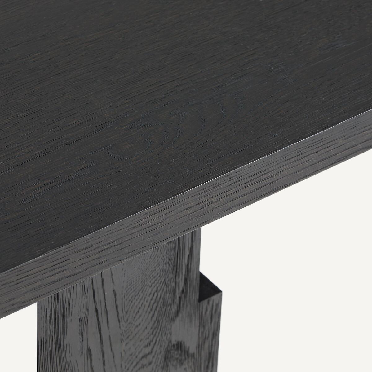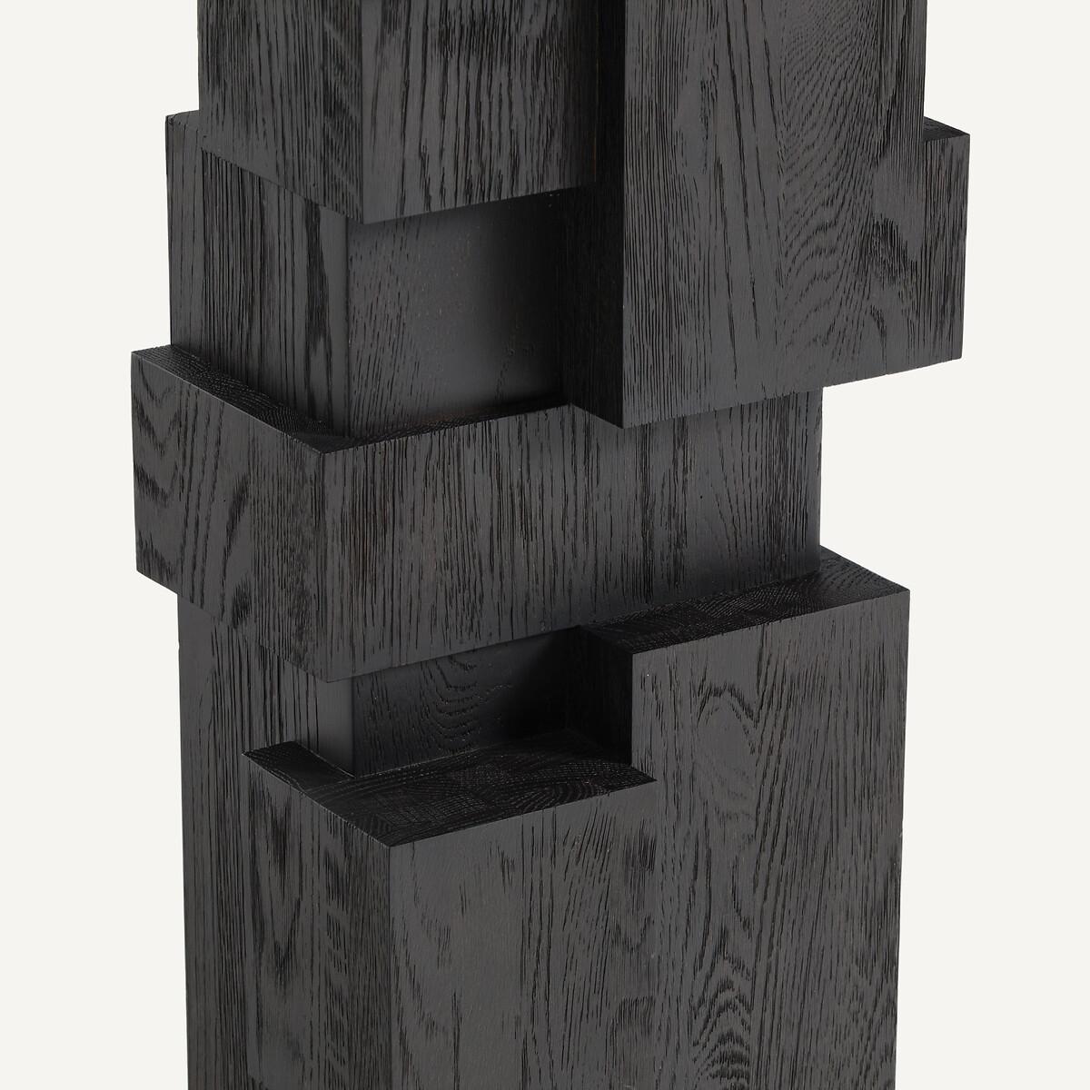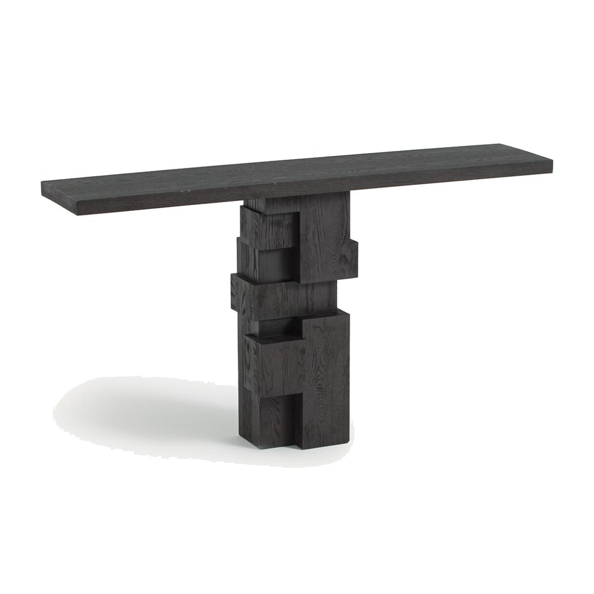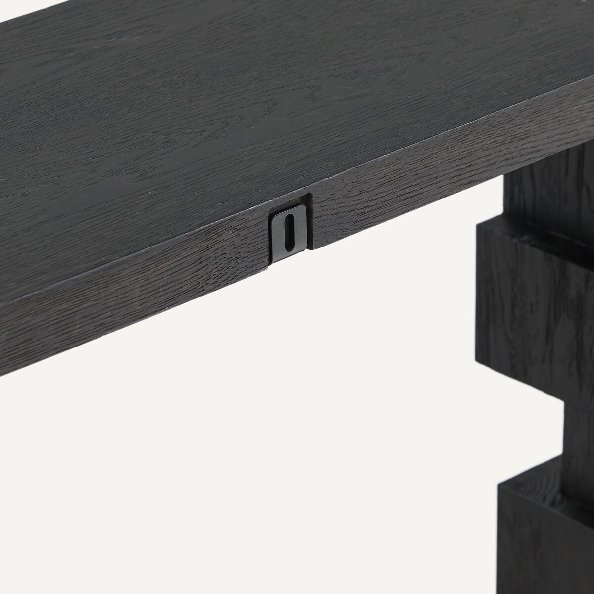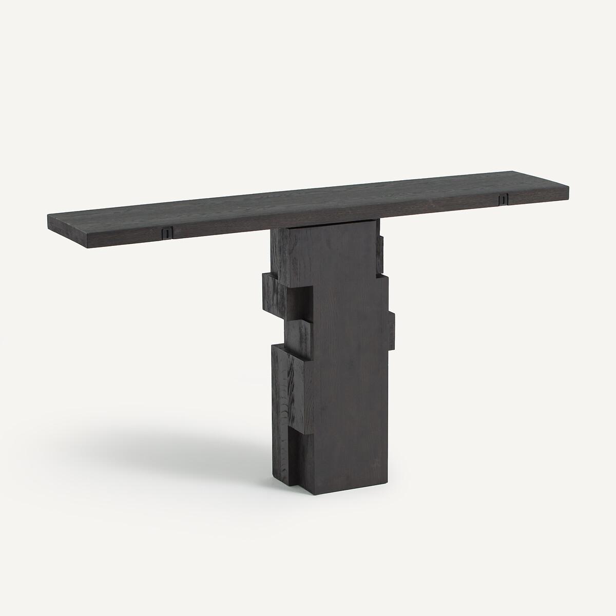 Combining primitive art and modernism, this console table, designed by AMPM, fuses rusticity and contemporary aesthetics. With its carved oak and clean lines, it highlights the work of the craftsman and the designer. Its central base, made up of interlocking wooden pieces, supports the table top, like a totem pole. Sculptural and refined. Product Details • Structure in stained solid oak • Table top and marquetry in stained oak-veneered MDF • FSC® certified wood • Polyurethane varnish finish • Mandatory wall fixing (screws and dowels not supplied)Quality Info • Wood is a living material. The differences in shades, grains and knots reinforce its character and authenticity.. Over time it may crack slightly. It is a process caused by variations in temperature and humidity. Dimensions • Width: 140cm • Height: 77cm • Depth: 29.5cm • This product requires assembly. • WOOD FROM SUSTAINABLY MANAGED FORESTS. FSC® certified wood comes from forests that are environmentally, socially and economically well managed. Dimensions and weight of parcel2 parcels • L148 x H11 x D37cm. 12kg • L87 x H29 x D45.5cm. 25kg
