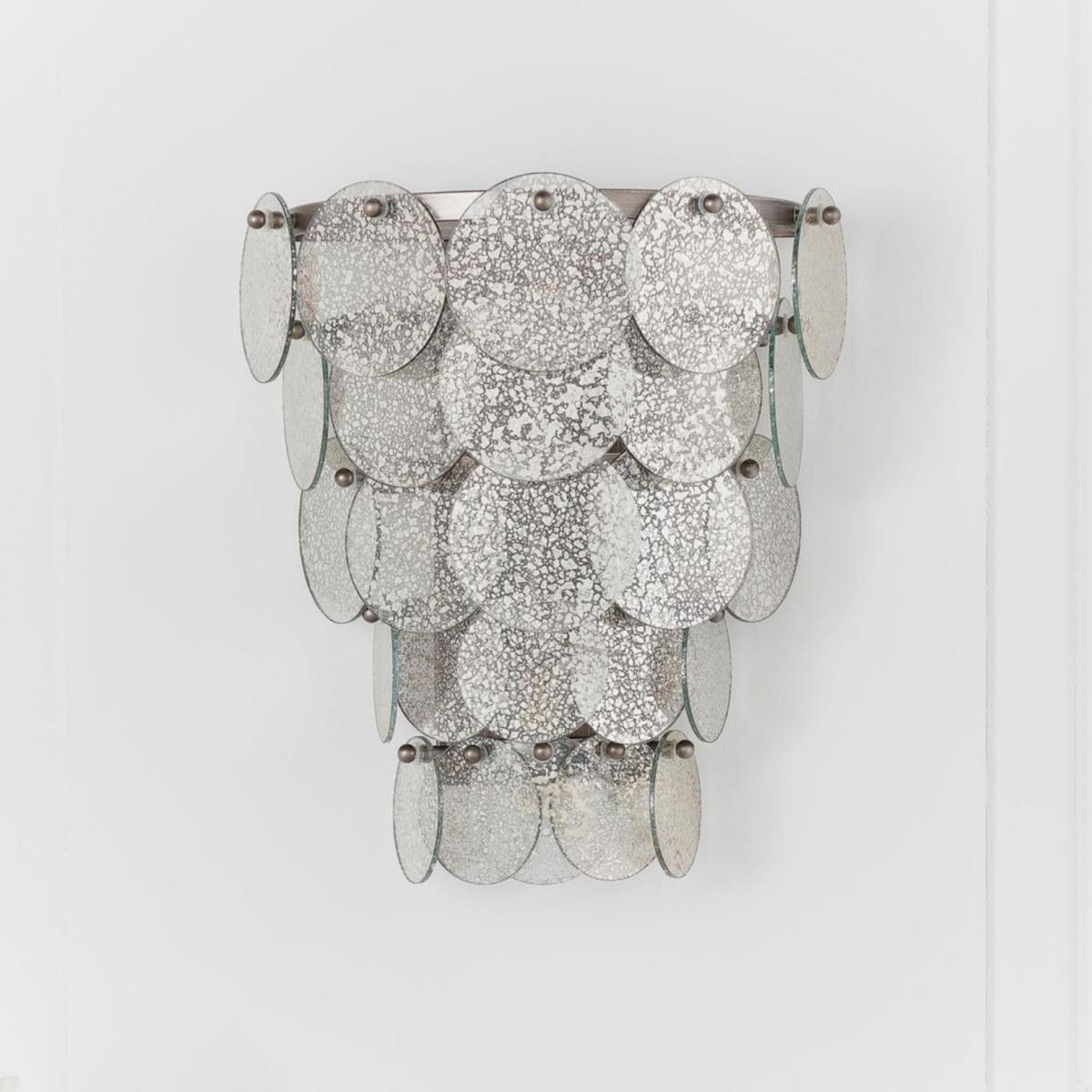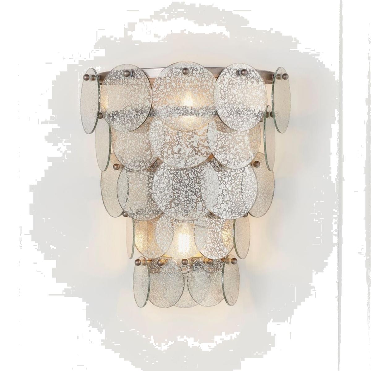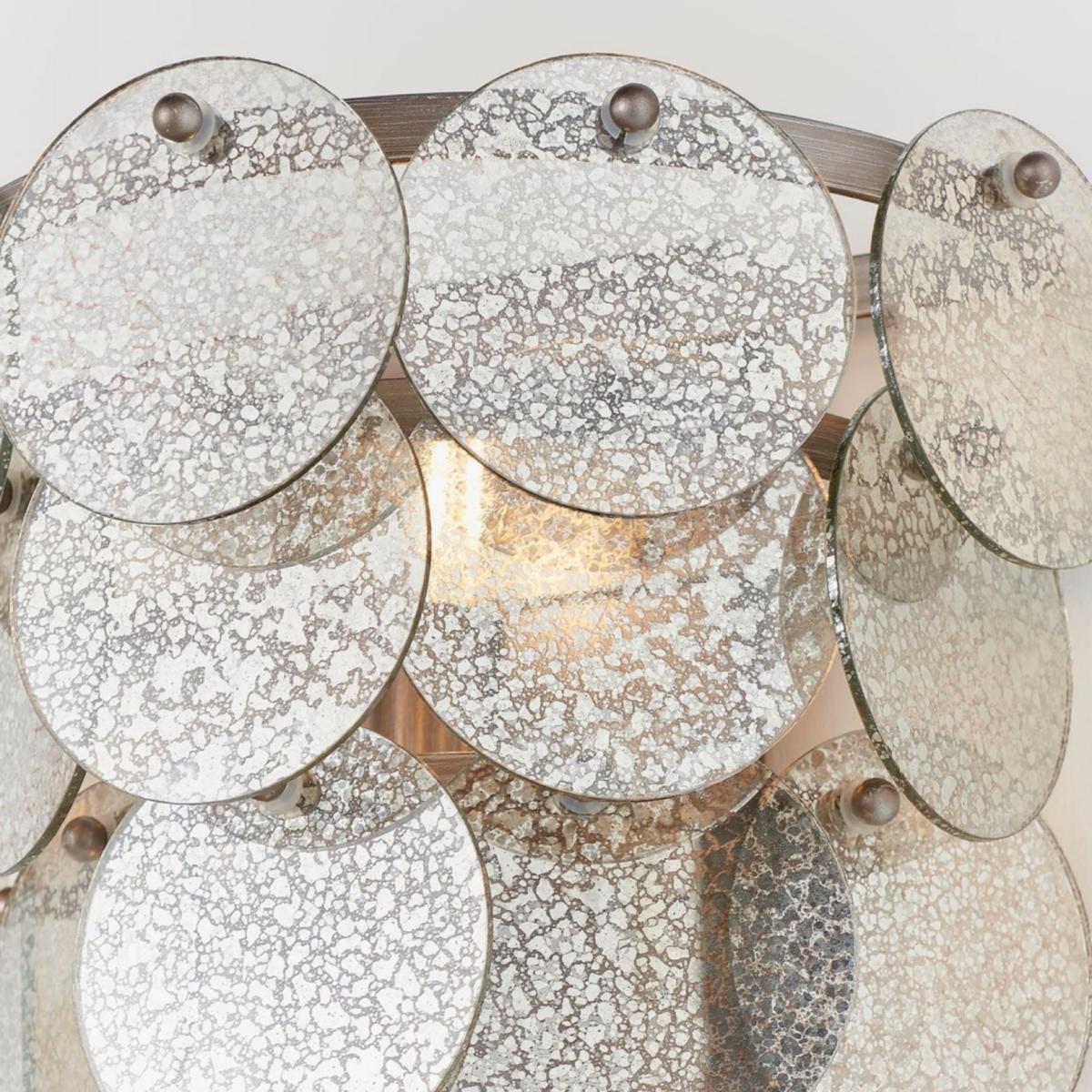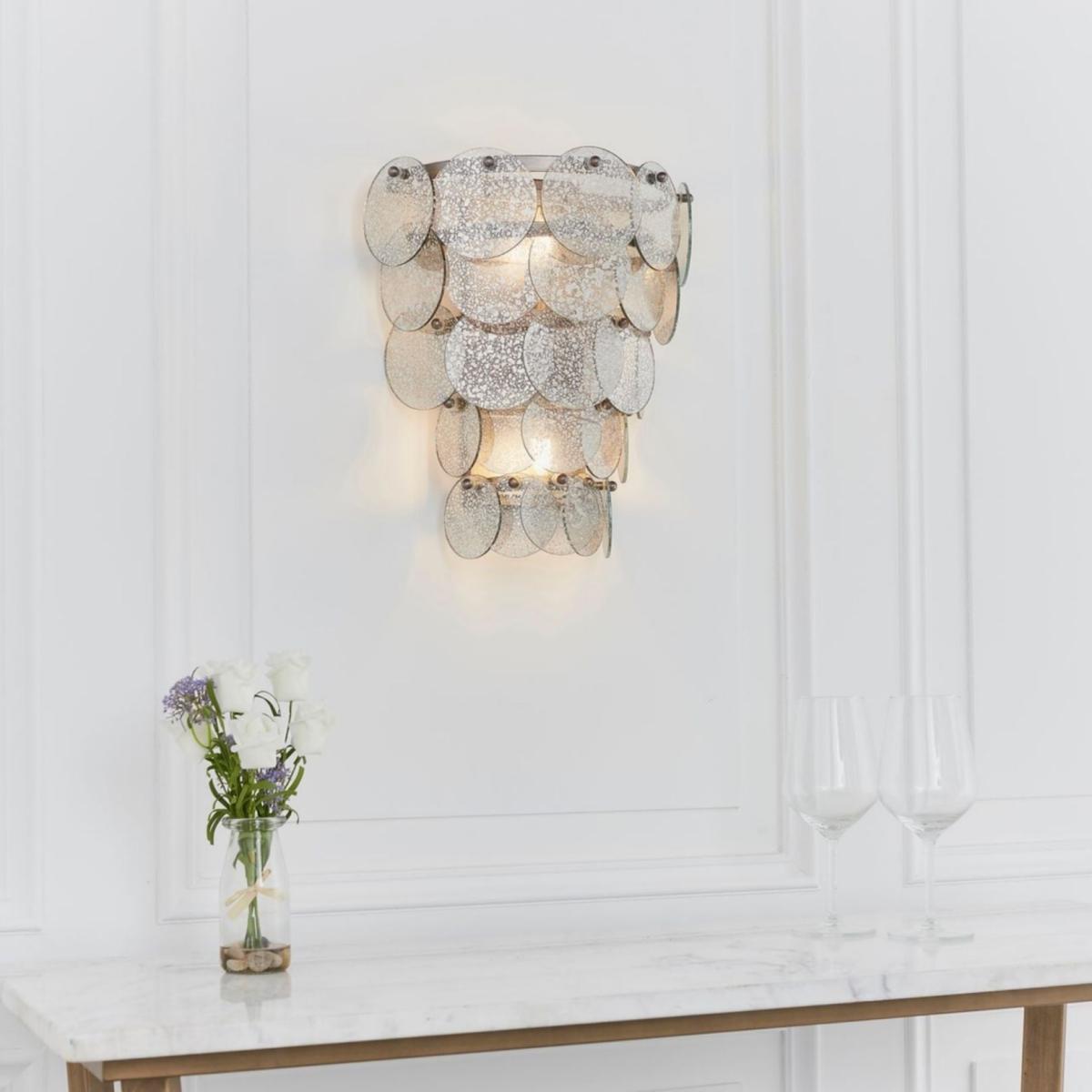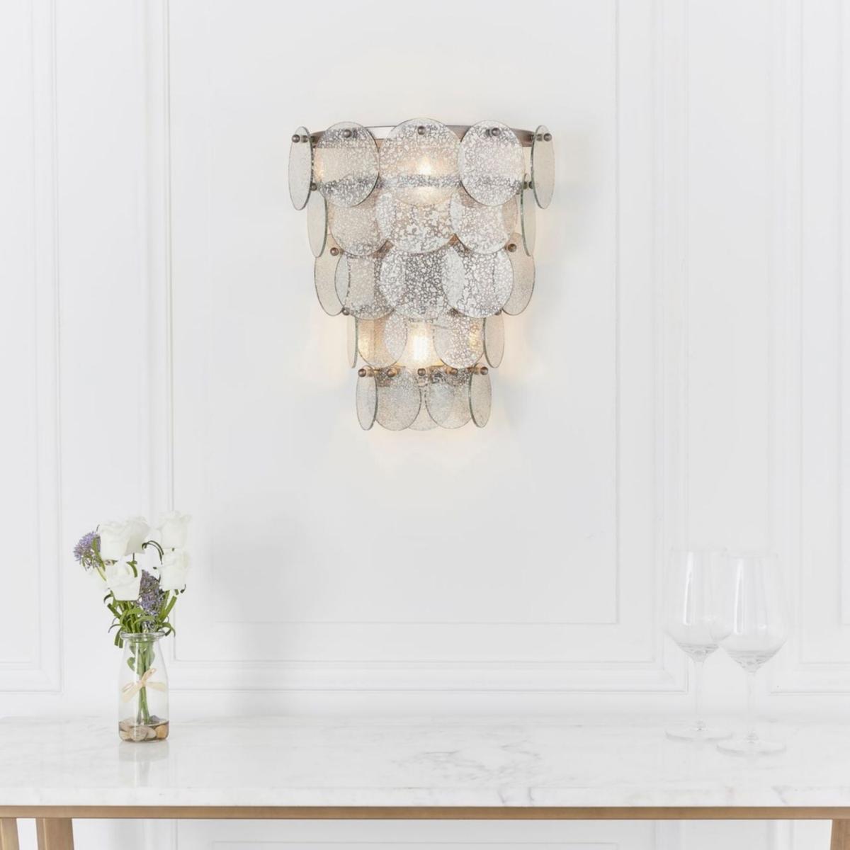 Kimana 2-light flush wall light, featuring antique silver-painted metalwork with mercury glass discs arranged in a tiered design. The Kimana 2-light wall light brings elegance and modern sophistication to your interiors. Featuring antique silver-painted metalwork, this striking design is adorned with ornate mercury glass discs, arranged in a beautiful tiered pattern. The up-and-down lighting creates a soft and ambient glow, highlighting the intricate details and adding depth to your space. Perfect for hallways, living rooms or bedrooms, the Kimana wall light complements both classic and contemporary decor styles. Its refined design and subtle illumination make it an ideal choice for enhancing any interior. Kimana 2-light flush wall light, featuring antique silver-painted metalwork with mercury glass discs arranged in a tiered design. The Kimana 2-light wall light brings elegance and modern sophistication to your interiors. Featuring antique silver-painted metalwork, this striking design is adorned with ornate mercury glass discs, arranged in a beautiful tiered pattern. The up-and-down lighting creates a soft and ambient glow, highlighting the intricate details and adding depth to your space. Perfect for hallways, living rooms or bedrooms, the Kimana wall light complements both classic and contemporary decor styles. Its refined design and subtle illumination make it an ideal choice for enhancing any interior.