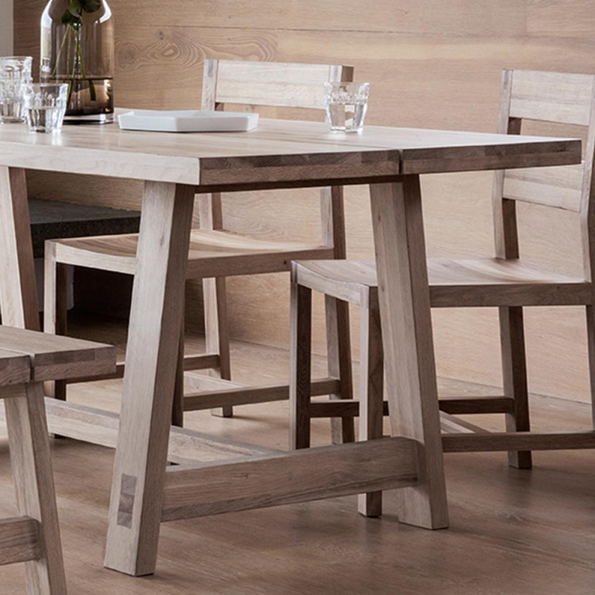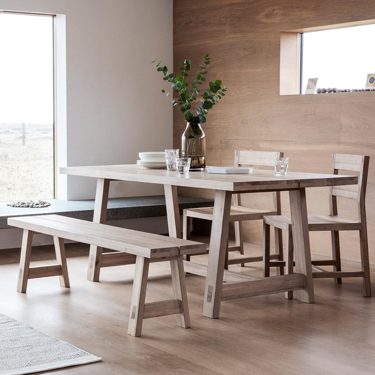 Create a statement with the Kimber Dining Table, adding a touch of the iconic Scandi trend to your space. With a solid oak top and robust structure, this table will not disappoint you with its quality and performance. Beautifully crafted from mellow solid oak, visually creating a naturally defined tone and textured surface. Wood is a fabulous piece of furniture to have within your home as it can transform an overall feeling of warmth and calmness. Why not complete the overall look with the matching chairs or bench.