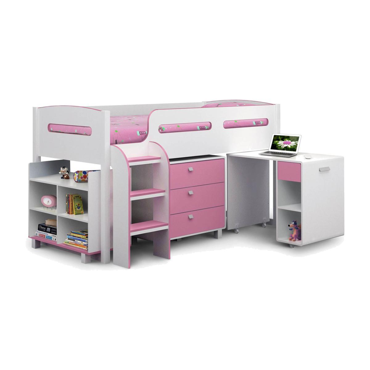 * Strong and durable wooden construction with painted finish* Solid slatted base- which allows air to circulate around your mattress* Features a pull-out desk, three drawer chest, a 6 section shelving unit and a sturdy ladder A useful cabin bed with plenty of storage finished in pink and white. The Julian Bowen Kimbo Cabin Bed in Pink is a cheerful option for your child's bedroom. Perfect for rooms where space is limited, this bed provides plenty of bedroom storage for toys, clothing and more! Fits a standard single mattress. Suitable for ages 6 years and over. Please note, unfortunately we cannot deliver this item to the Channel Islands.