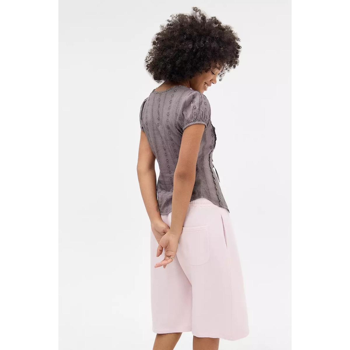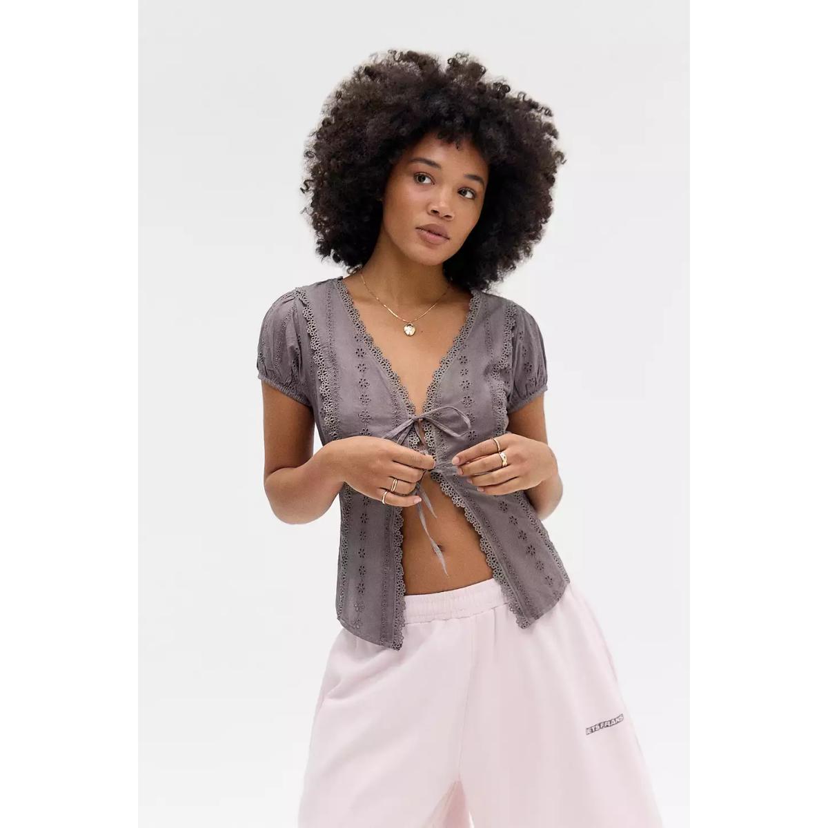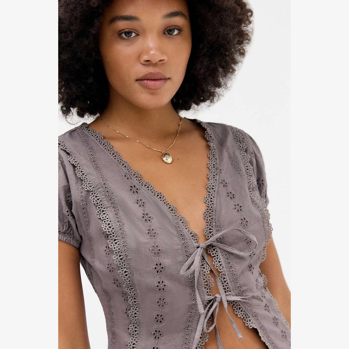 Pretty blouse from Kimchi Blue with delicate broderie anglaise detailing. Slim-fit silhouette crafted from lightweight cotton, complete with a plunging V-neck, short sleeves, elasticated cuffs, tie-up front and curved hem. UO exclusive. **Content + Care** \- 100% Cotton \- Lace: 100% Polyester \- Machine wash **Size + Fit** \- Model is 172.5cm/5'8" and wearing size Small \- Use our size guide to check how this product fits