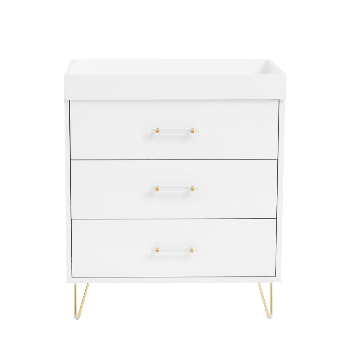 * 3 Drawer chest * Acrylic handles * Hairpin legs Featuring contemporary acrylic handles and sturdy metal hairpin legs with floor protectors, this chest offers a modern aesthetic that complements any nursery. The spacious drawers provide ample storage for baby essentials, while the top surface serves as a convenient changing area. Designed to grow with your child, this versatile piece is both practical and stylish.