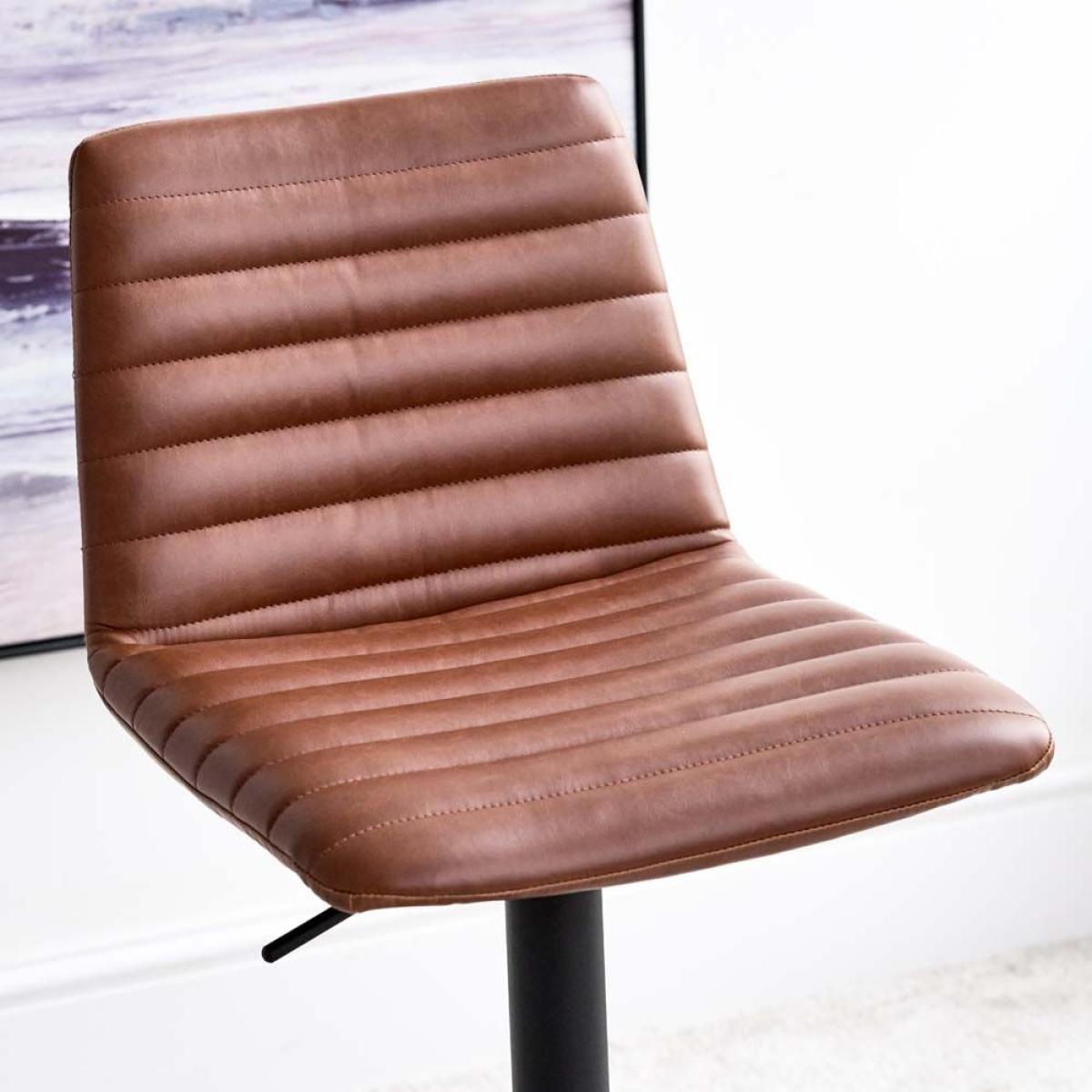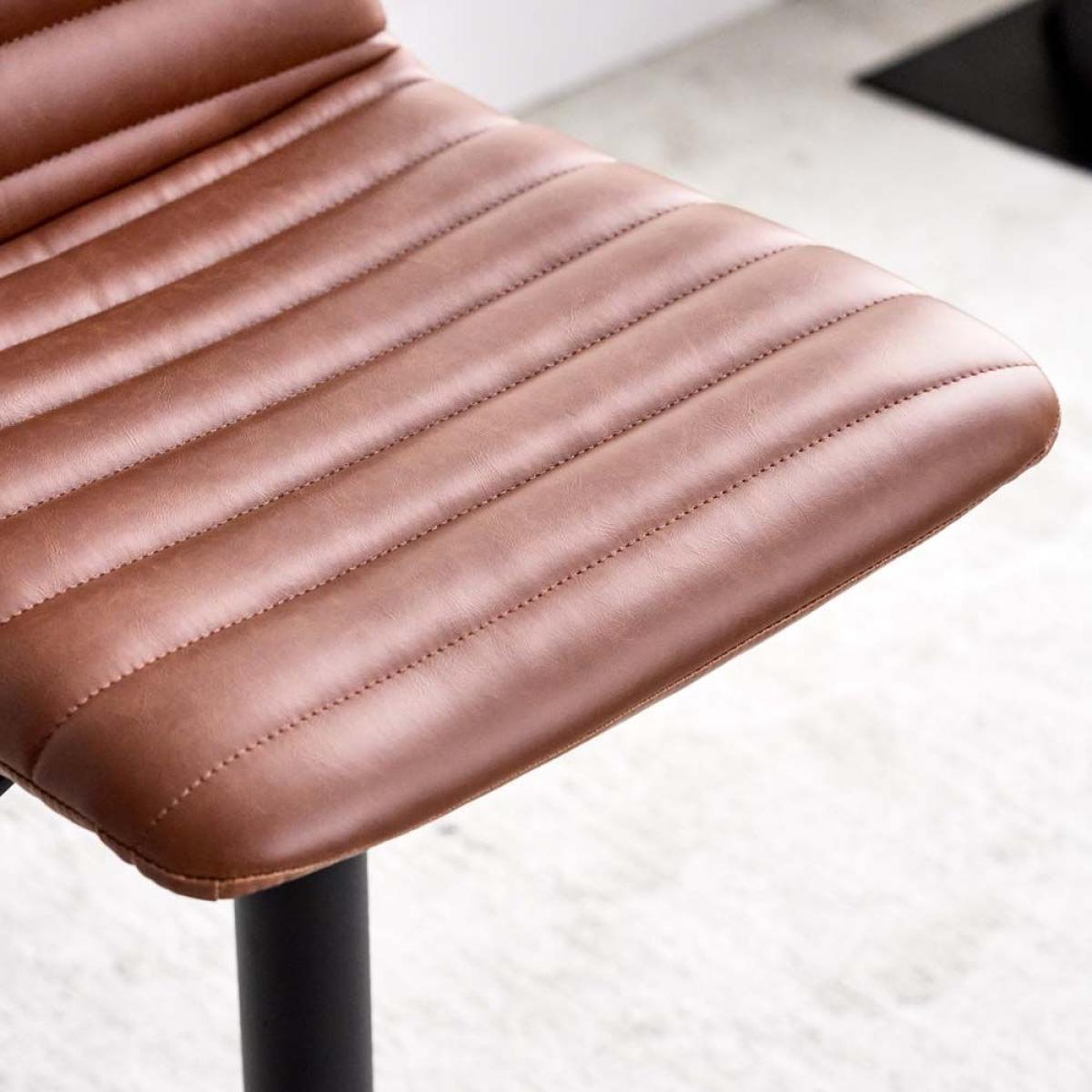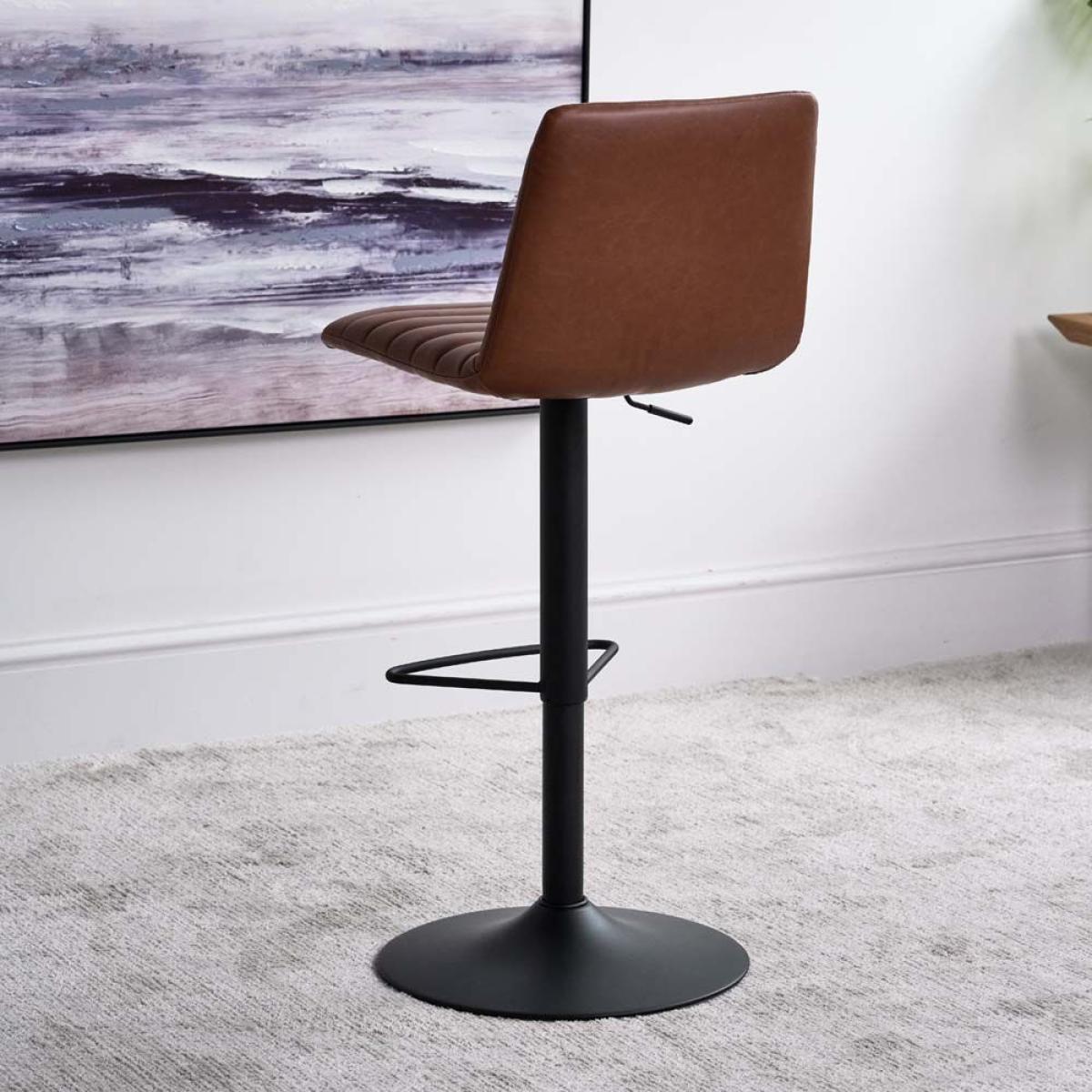 The Kimmy Barstool is a generously upholstered stool with soft padded ribs of faux leather giving the stool a modern and versatile look. The stool has a powder coated black metal stem curving out to a round foot. With a foot rest and gas lift, the stool can be adjusted to your desired height with ease.