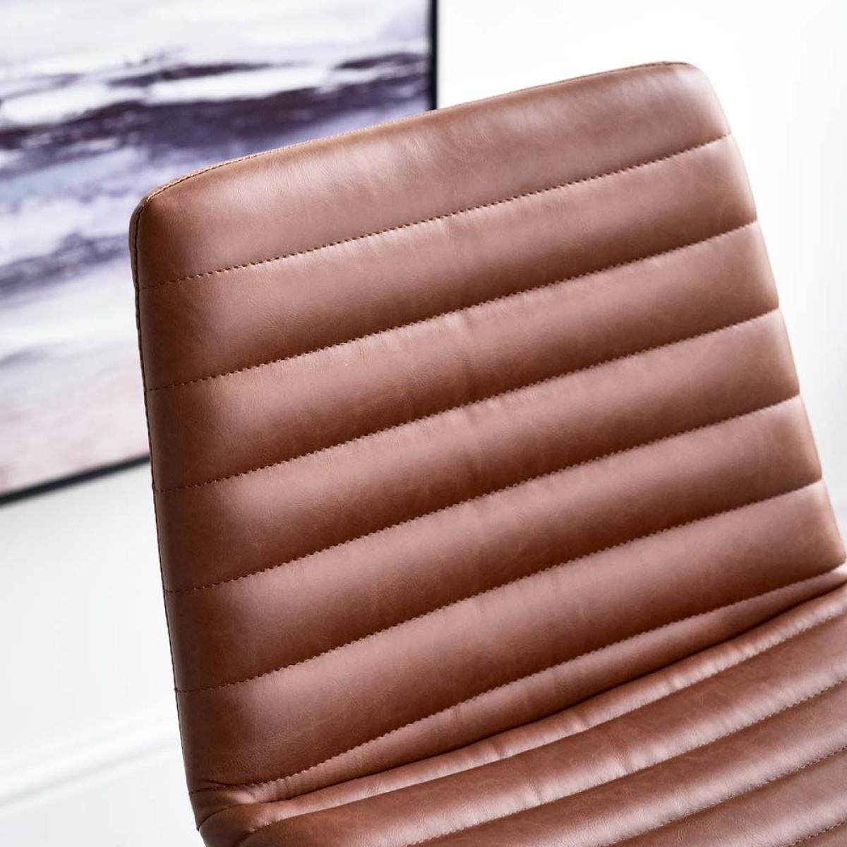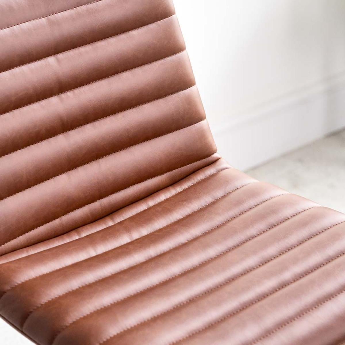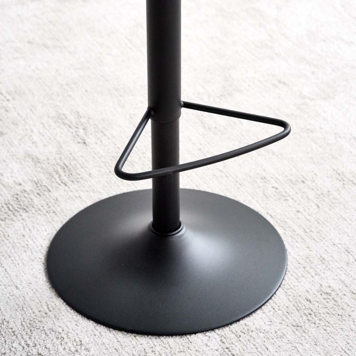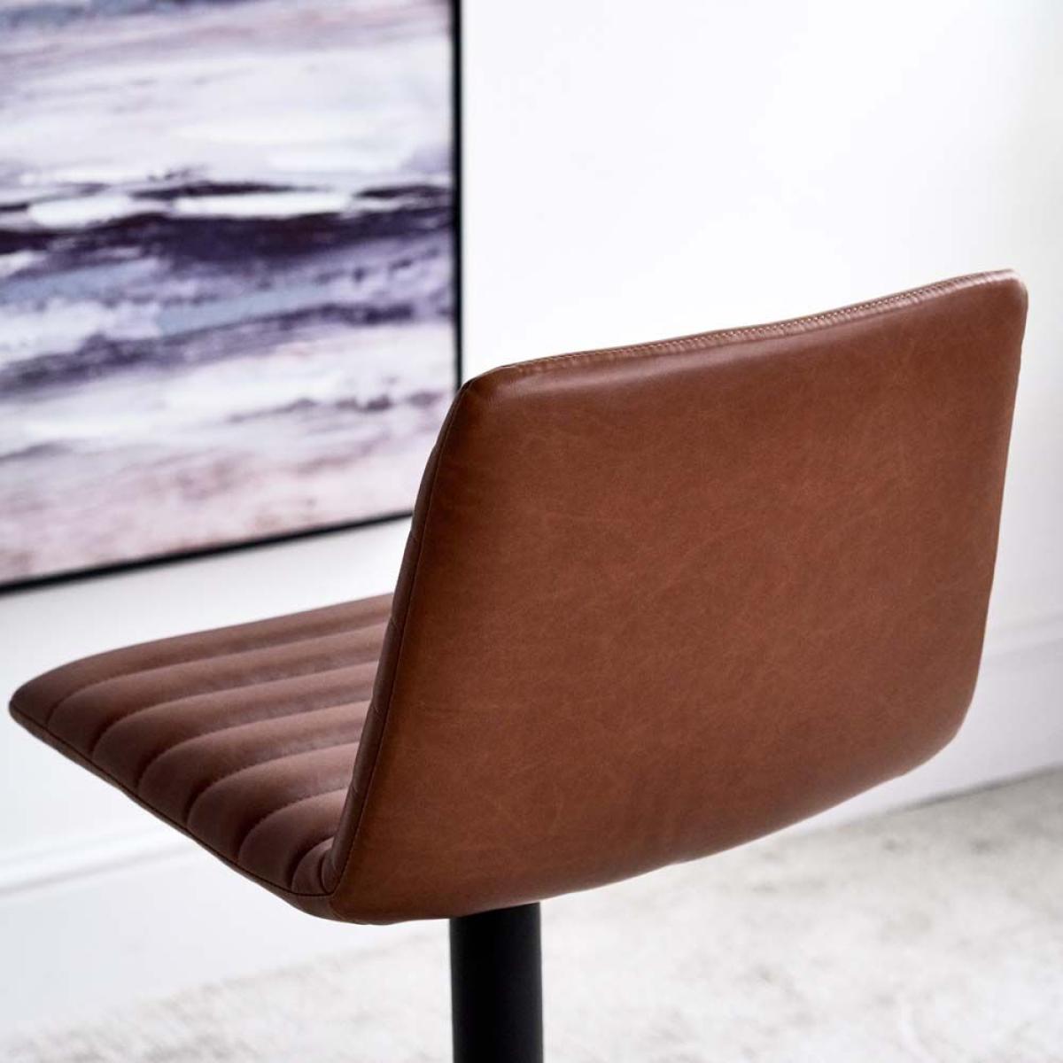 The Kimmy Barstool is a generously upholstered stool with soft padded ribs of faux leather giving the stool a modern and versatile look. The stool has a powder coated black metal stem curving out to a round foot. With a foot rest and gas lift, the stool can be adjusted to your desired height with ease.