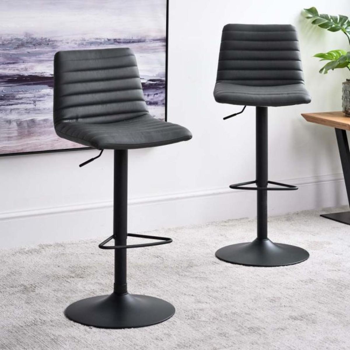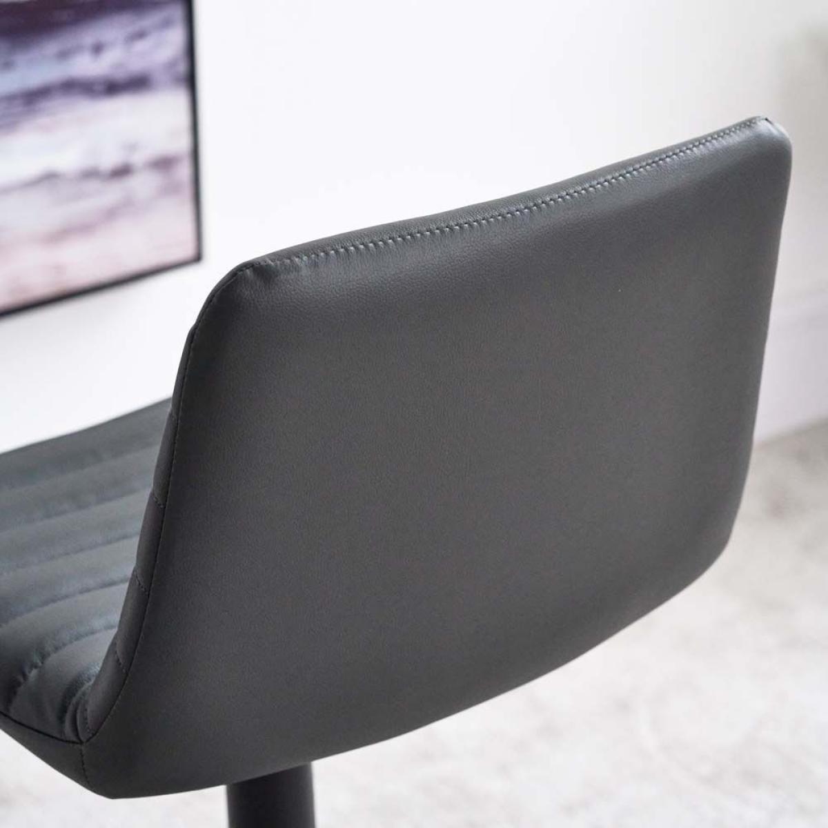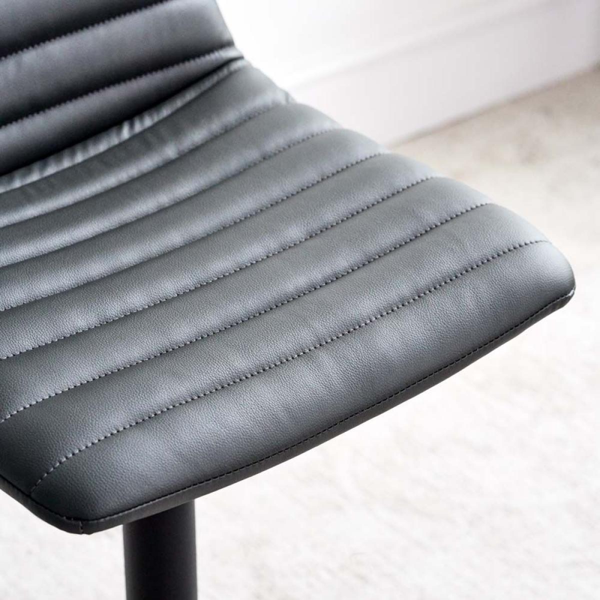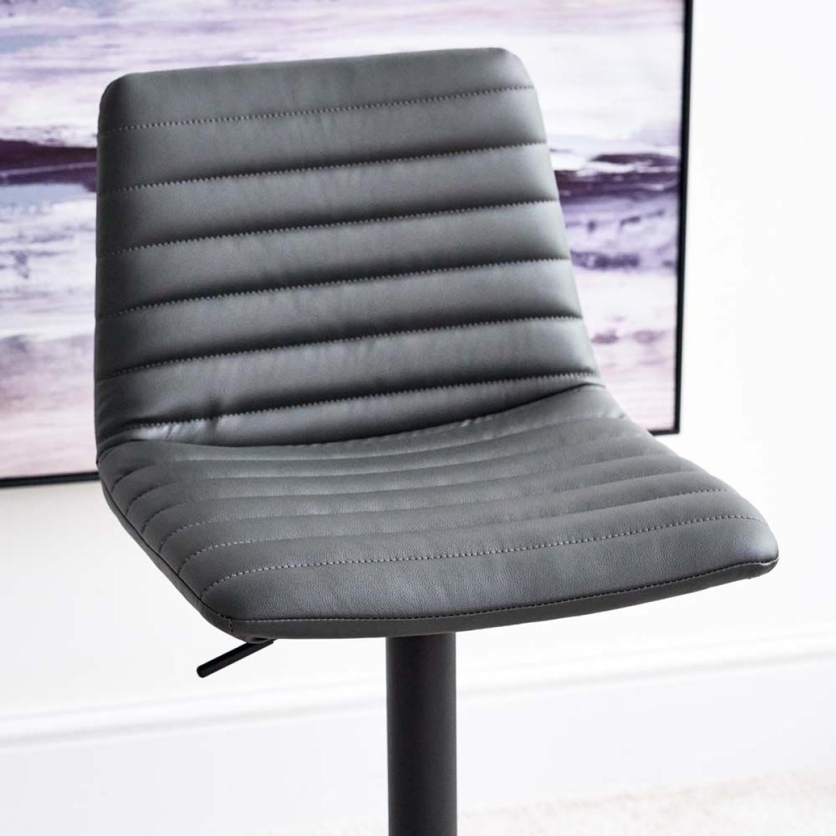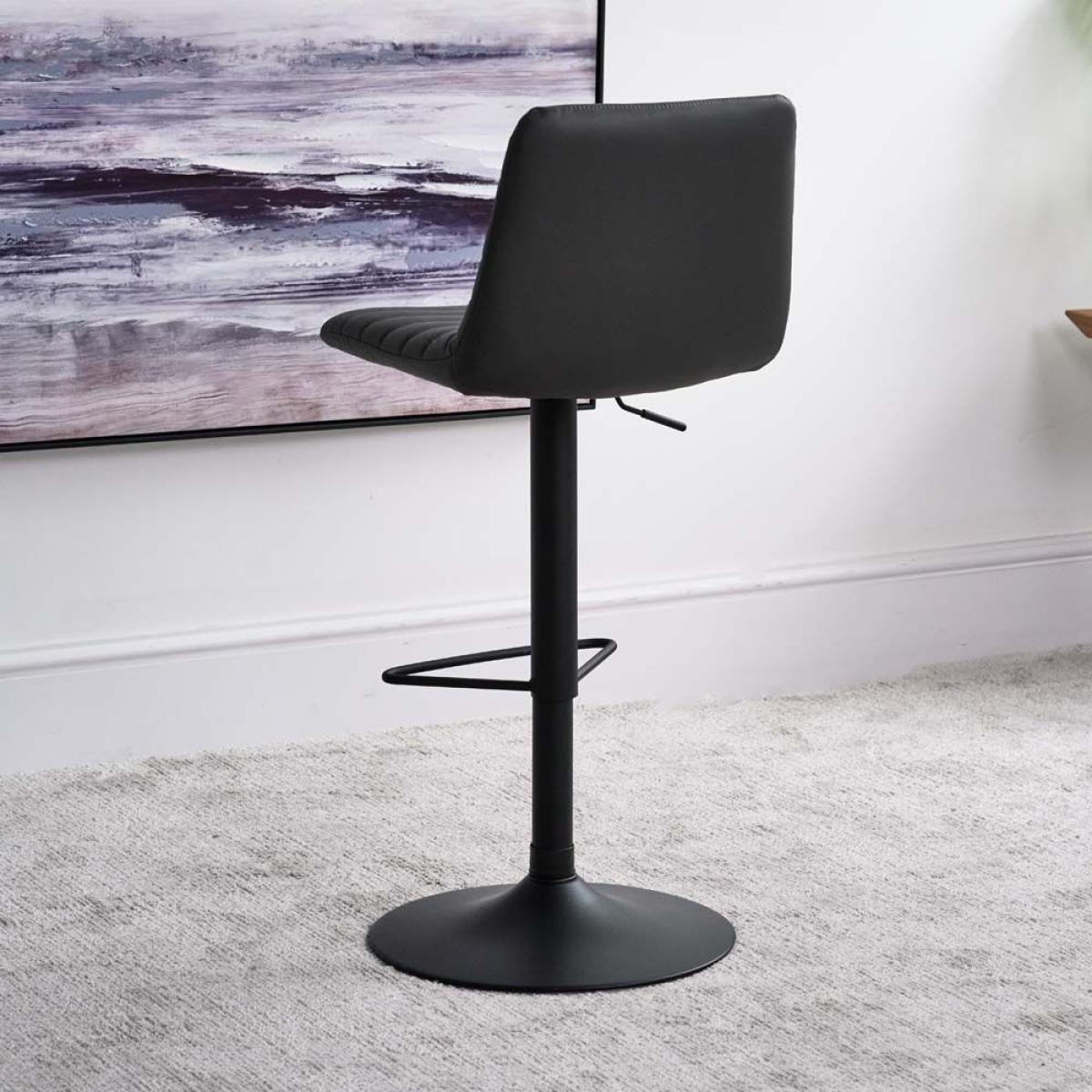 The Kimmy Barstool is a soft upholstered stool with well padded ribs of faux leather giving the stool a modern look that would suit many homestyles. The stool has a powder coated black metal stem curving out to a round foot. With a foot rest and gas lift, the stool can be adjusted to your desired height with ease.