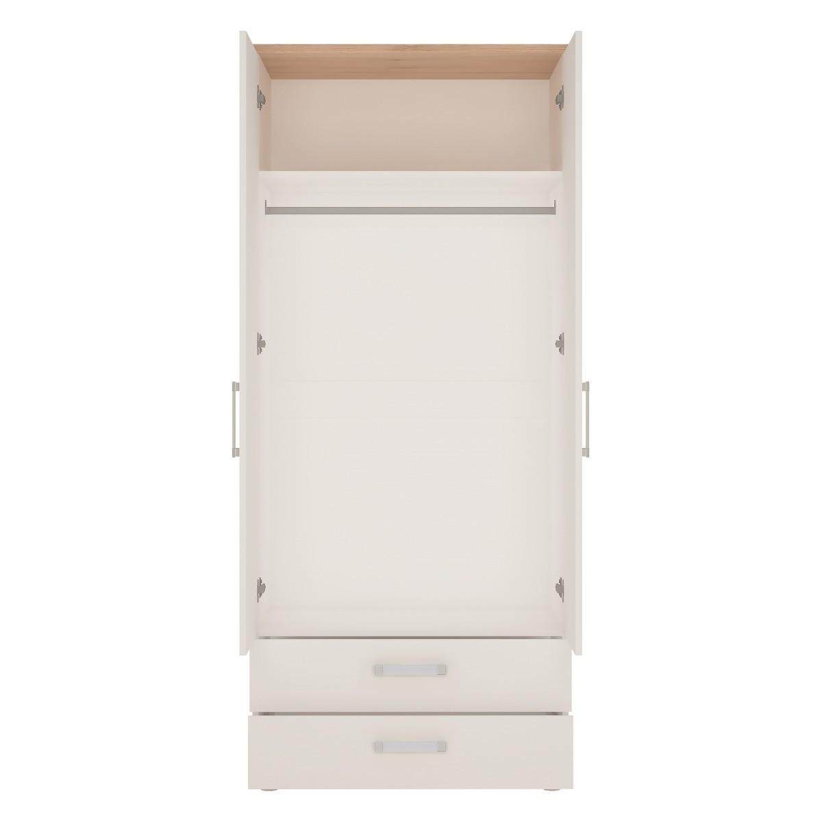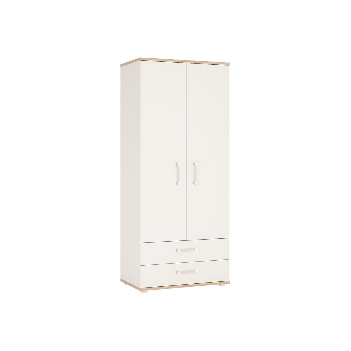 Kinder 2 Door 2 Drawer Wardrobe in Light Oak and White High Gloss. Admire the clothes hanging invitingly in the impressive amount of space. Children will enjoy rummaging through their clothes on the hanging rail, shelf and in the two useful drawers at the base. Highly durable child-friendly laminate. Made from PEFC Certified sustainable wood Attractive opalino handles in 4 colours. Easy self assembly Contemporary light oak and high white gloss finish